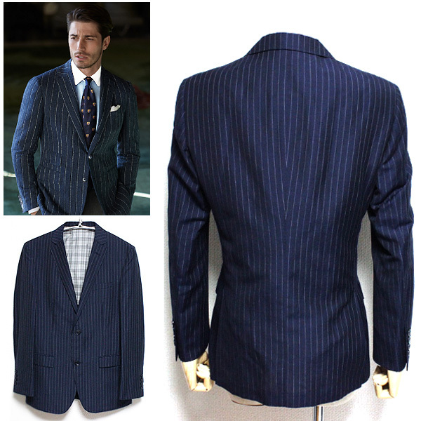 ジャケットは ピンストライプ 柄の2ボタンで 全てのボタンにブランドロゴ入りで