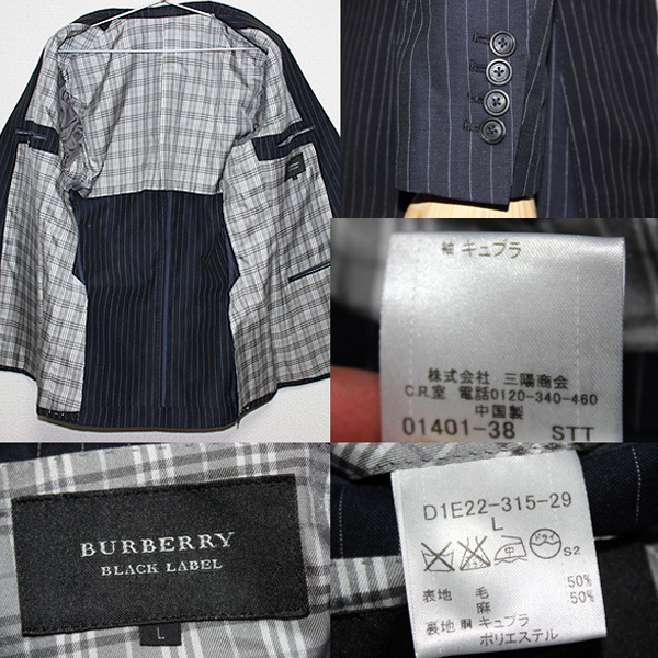 極美品!L(3) バーバリーブラックレーベル リネン混(麻) ストライプ メンズ 2Bテーラードジャケット 濃紺ブレザー■BURBERRY BLACK LABEL