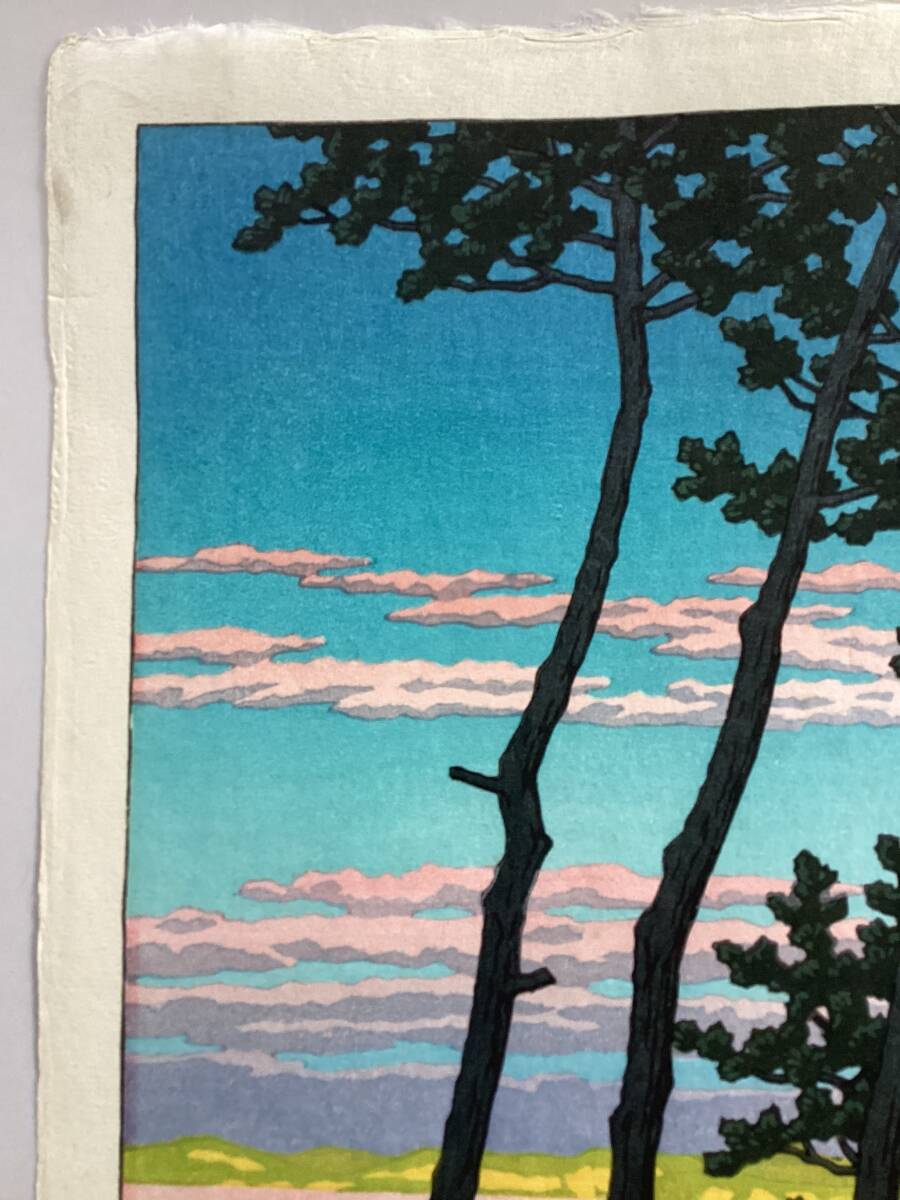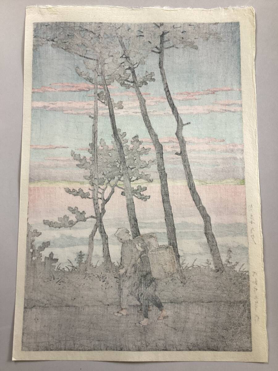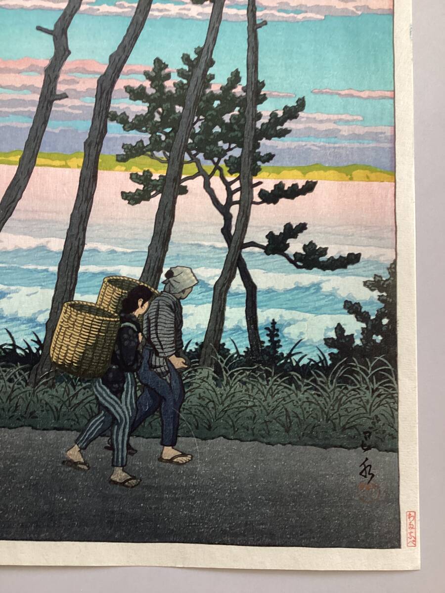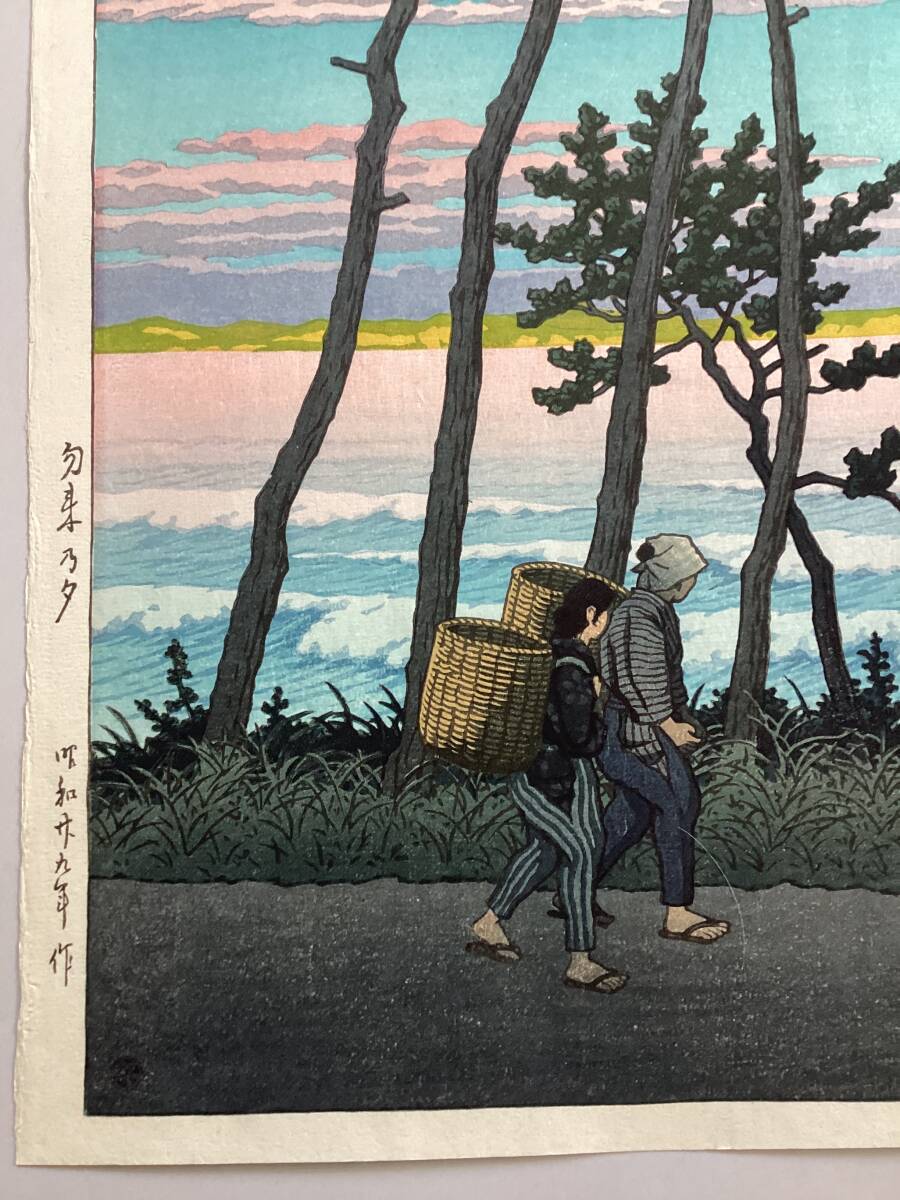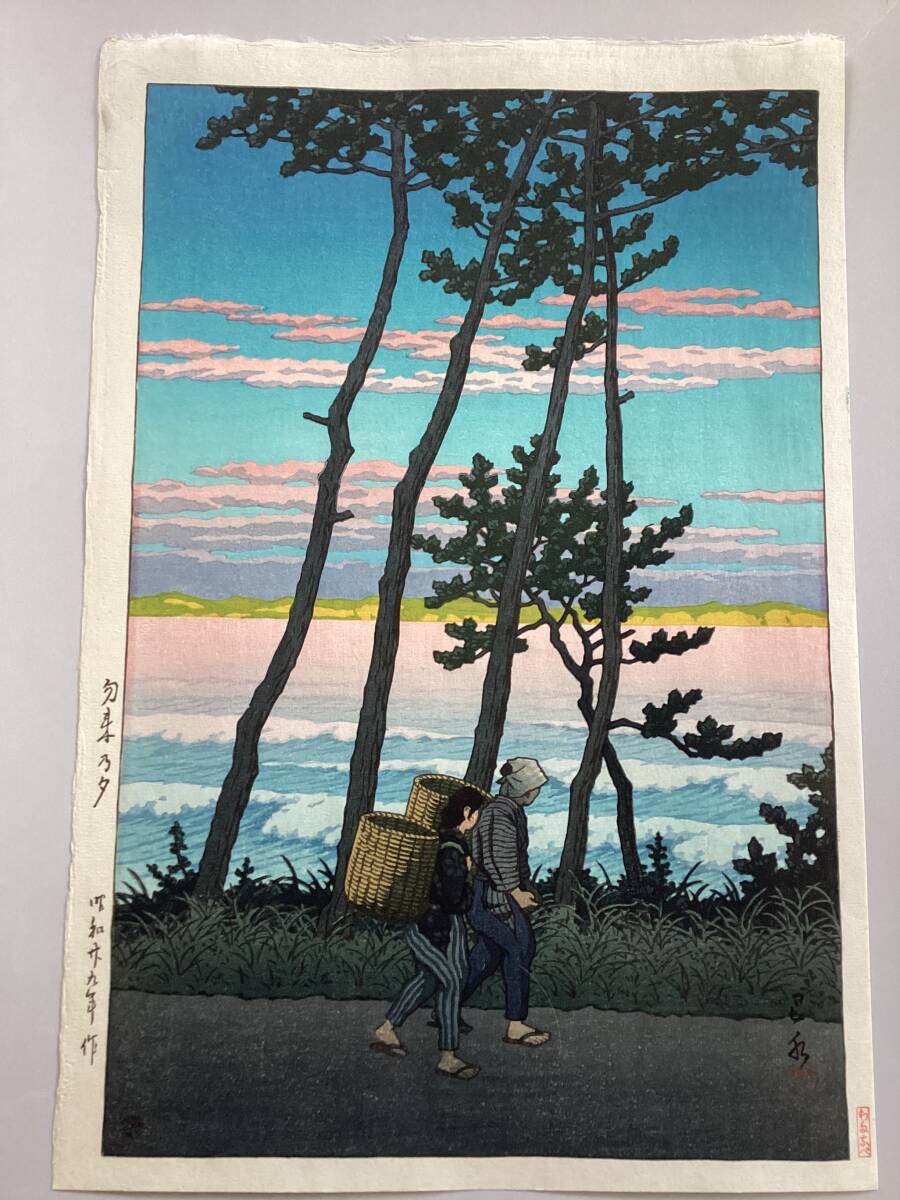 吉田博と共に新版画を代表する巨匠「川瀬巴水」の「勿来乃夕」(渡邊 後摺/平成摺・赤判) の出品です。