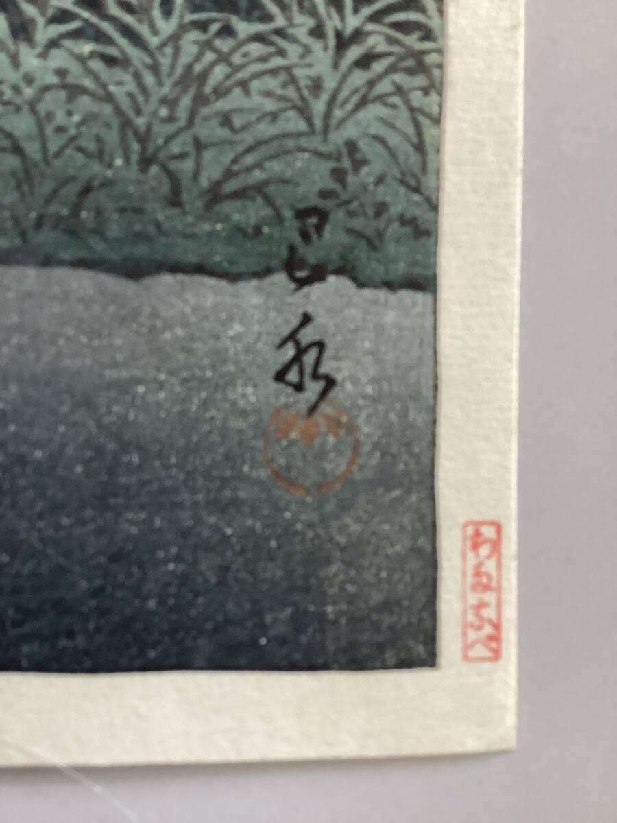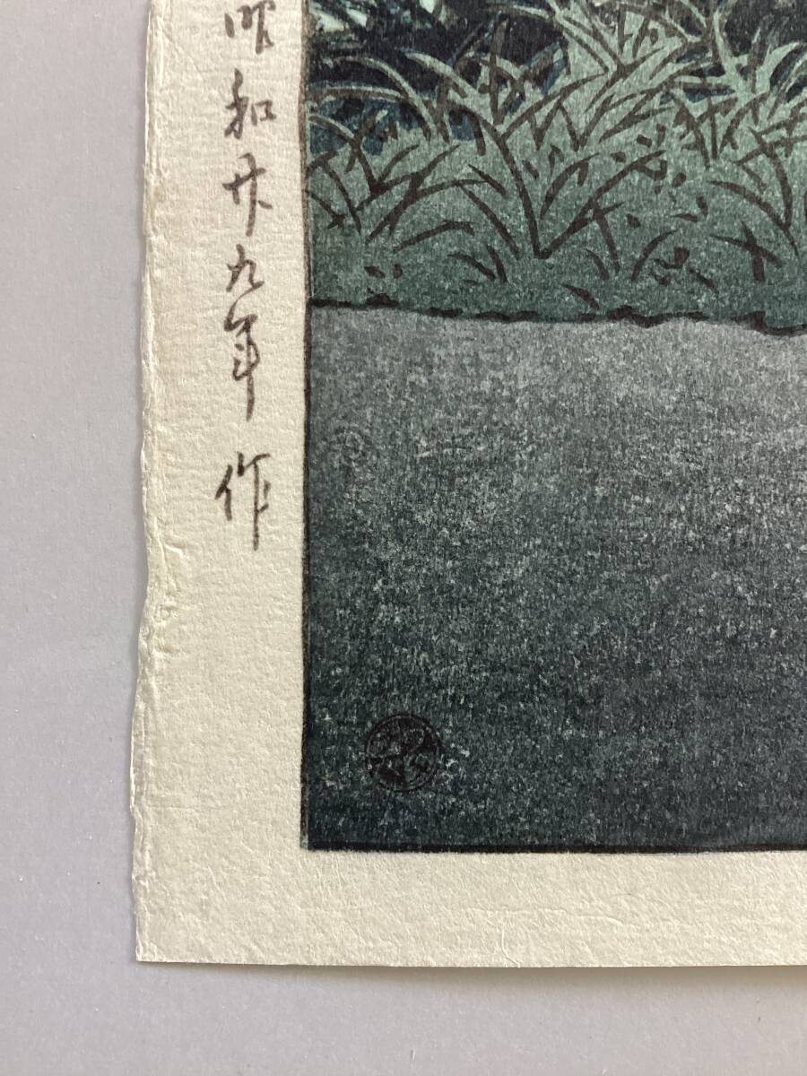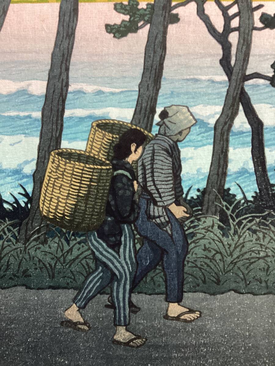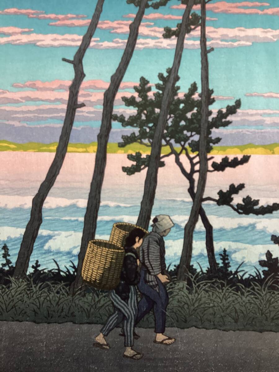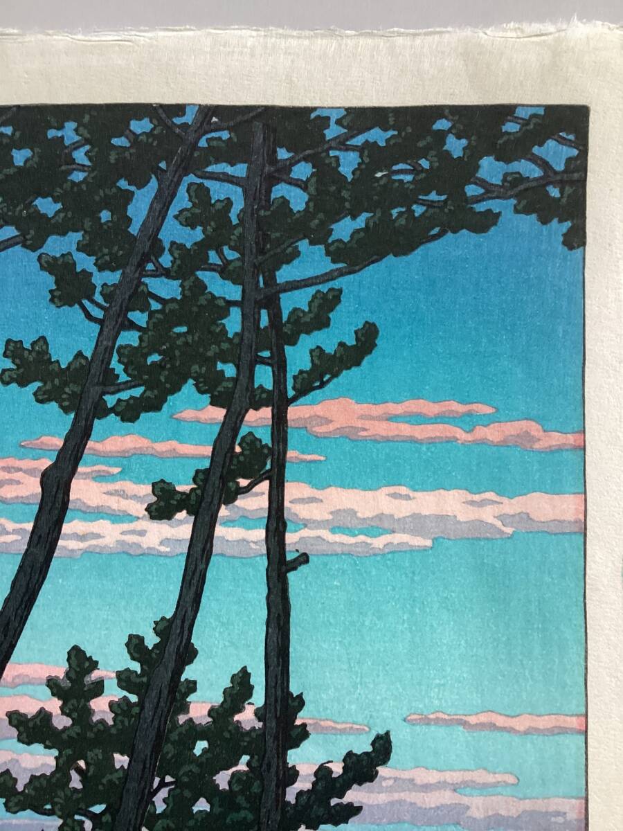 吉田博と共に新版画を代表する巨匠「川瀬巴水」の「勿来乃夕」(渡邊 後摺/平成摺・赤判) の出品です。