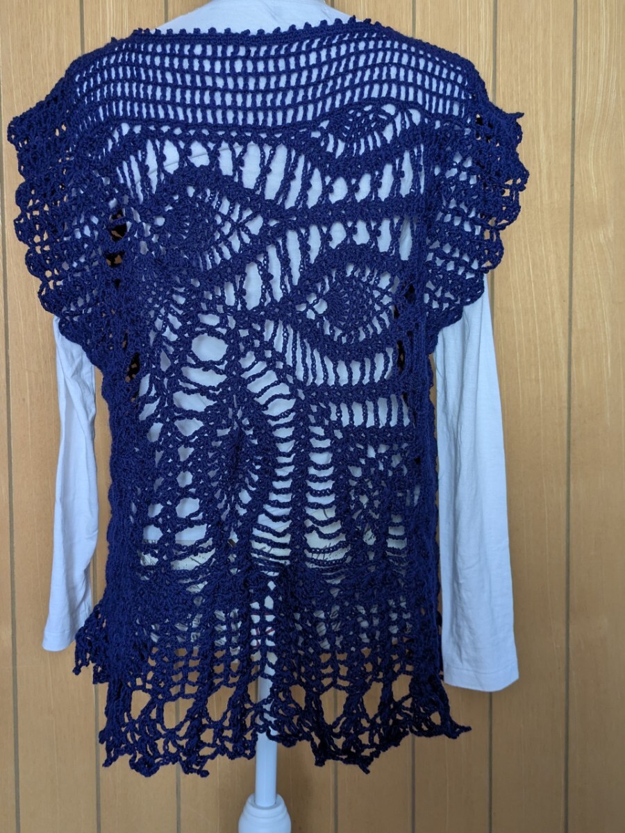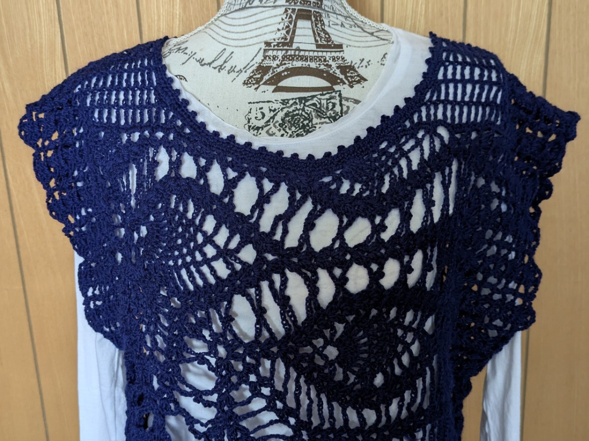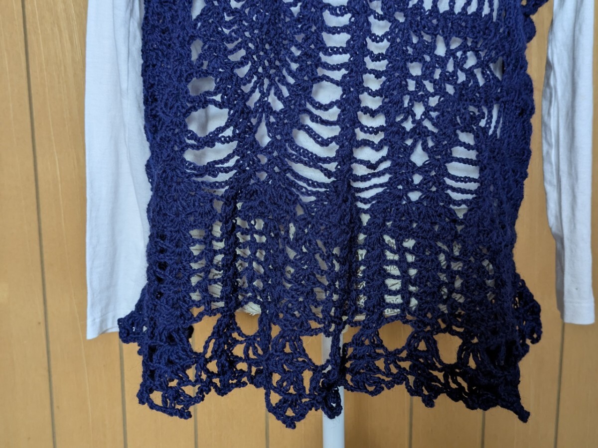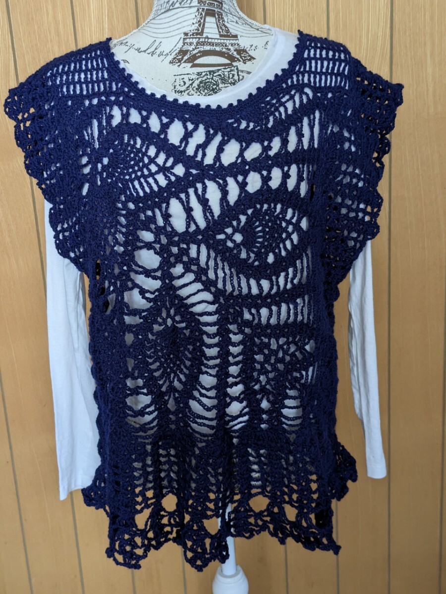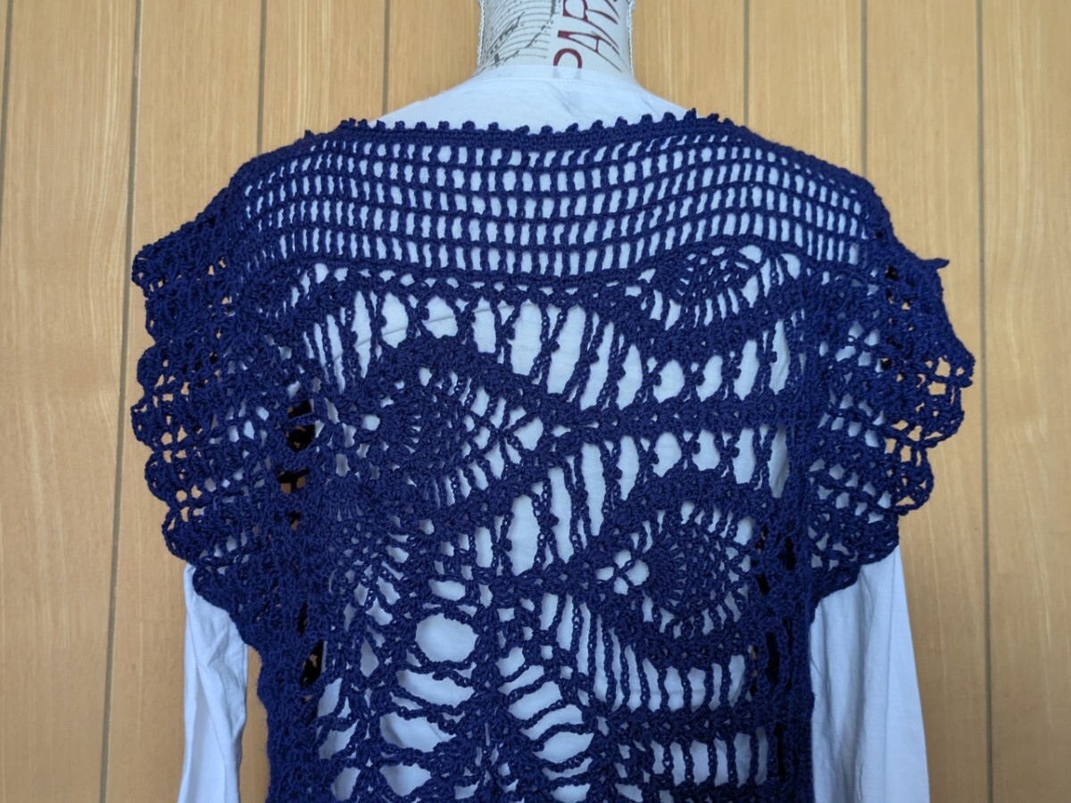 中央に変形パイナップル編み、その周りも模様編みで囲んだ素敵なデザインです。薄くて軽くて暖かいてす。