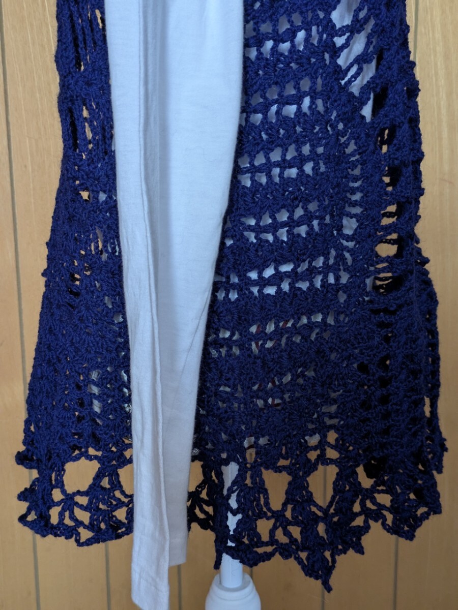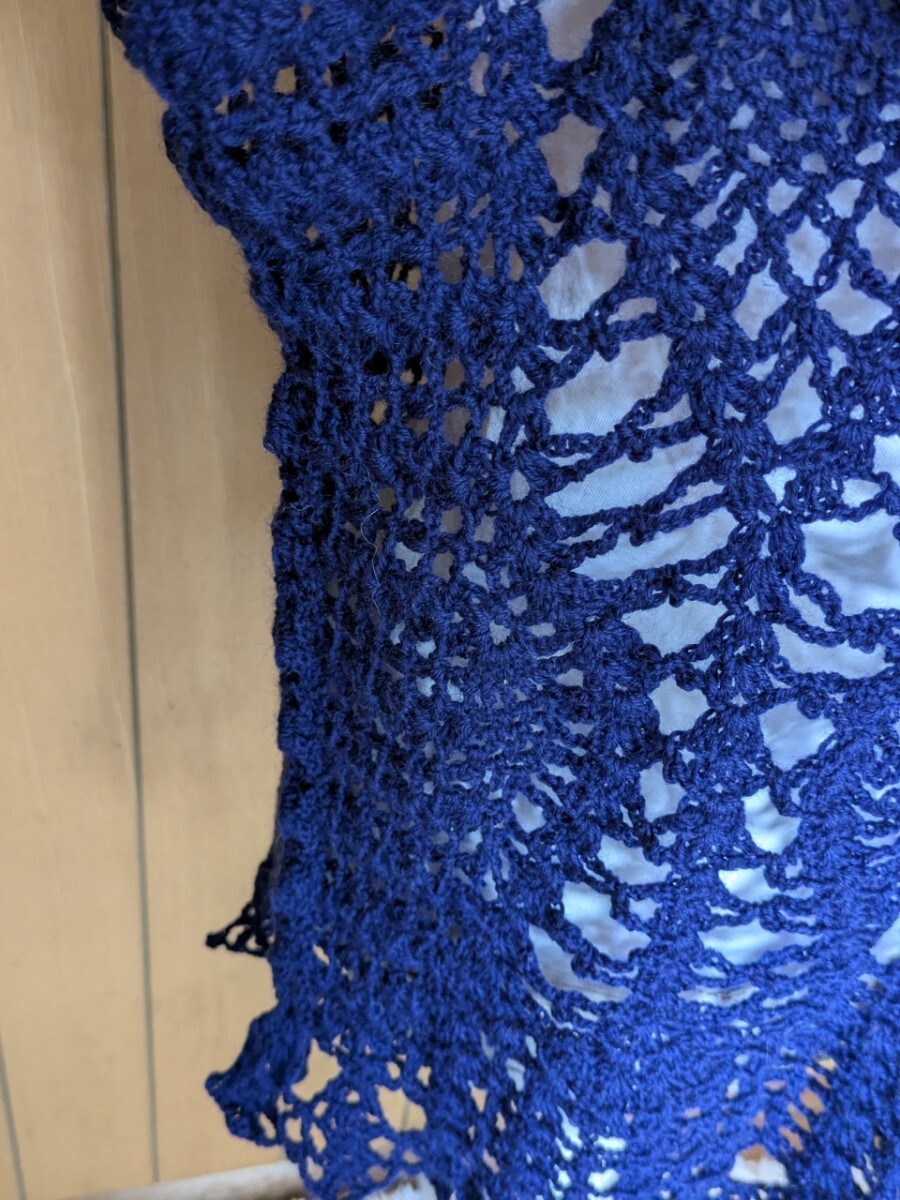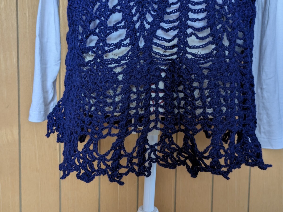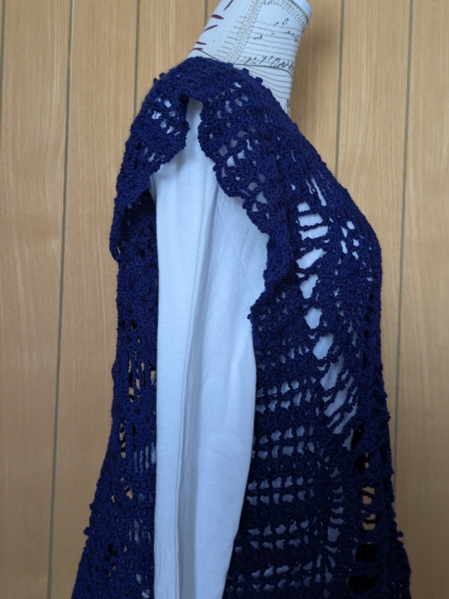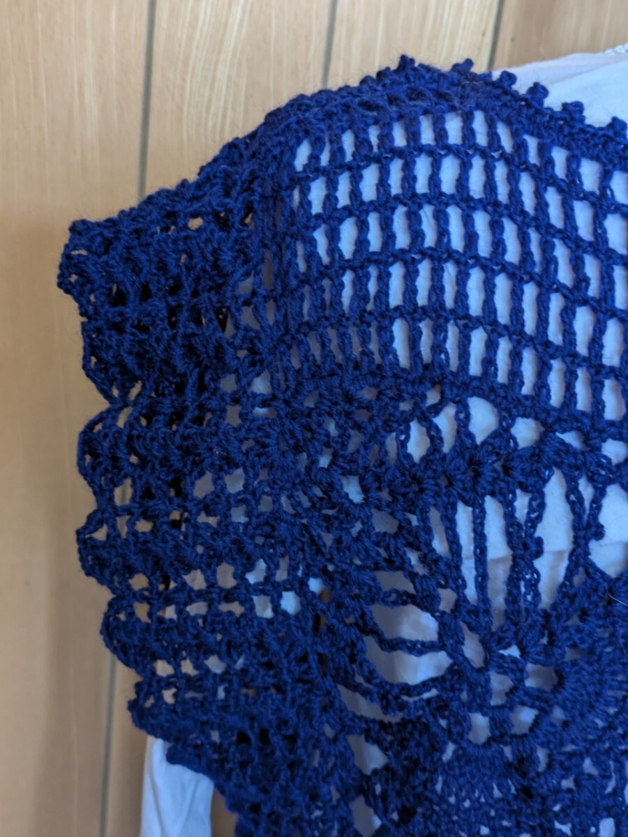 中央に変形パイナップル編み、その周りも模様編みで囲んだ素敵なデザインです。薄くて軽くて暖かいてす。