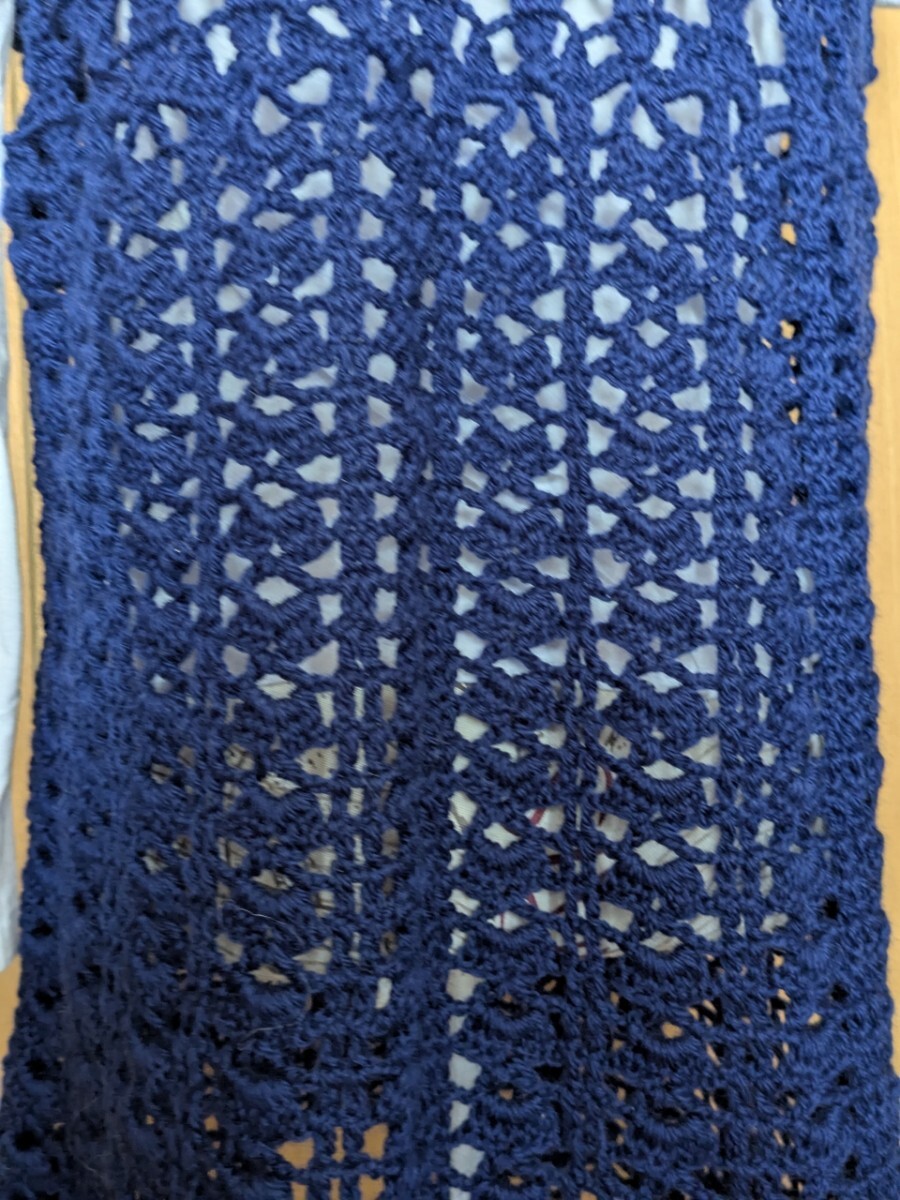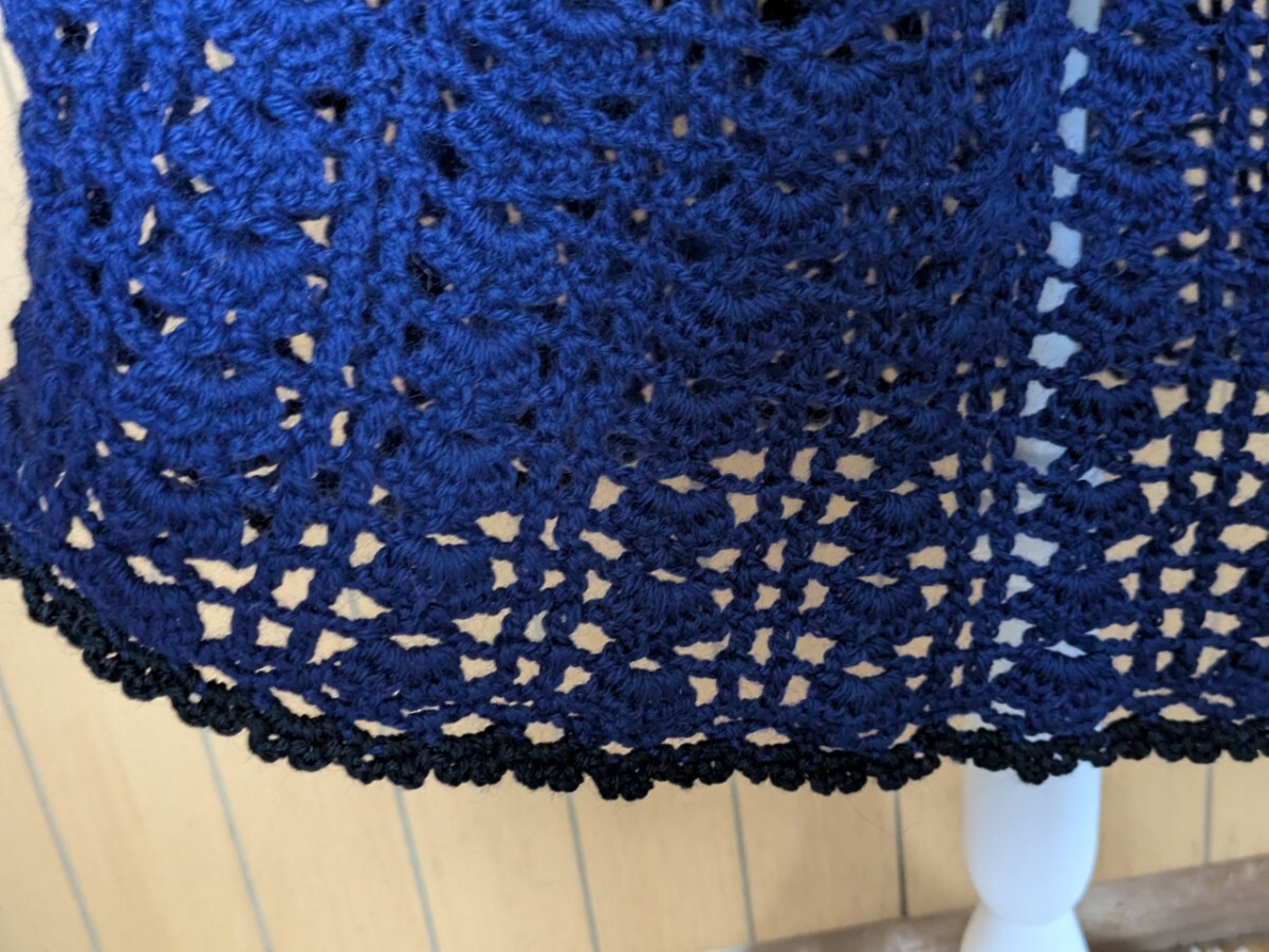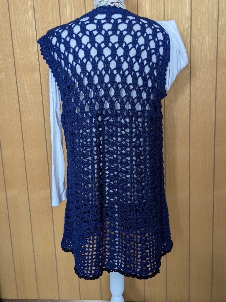 やや厚みのある総模様編みのロングベストです。裾は黒色で縁編み。着用するととても綺麗な模様が現れます。
