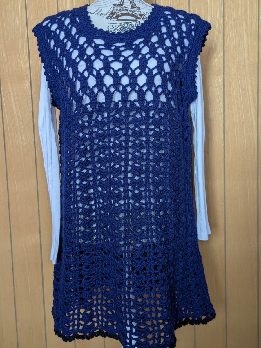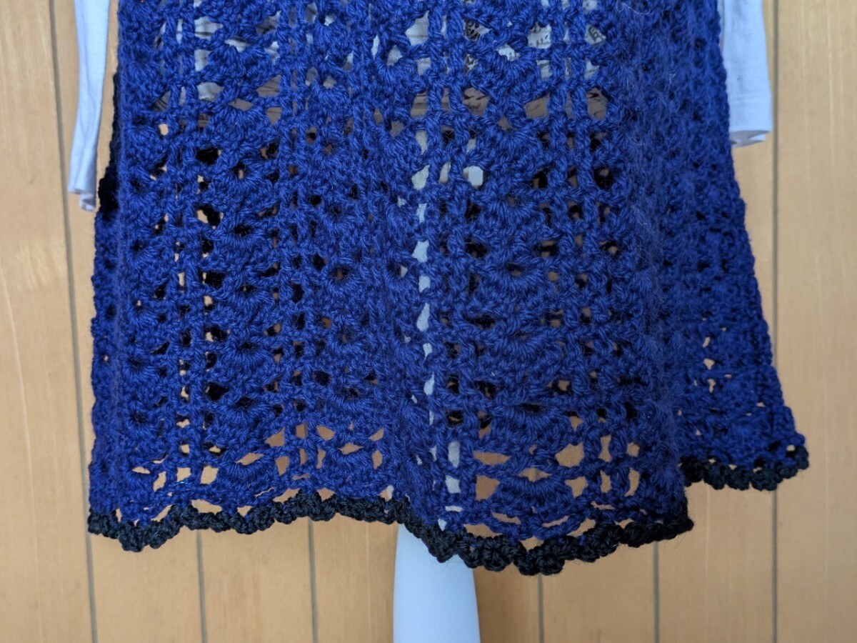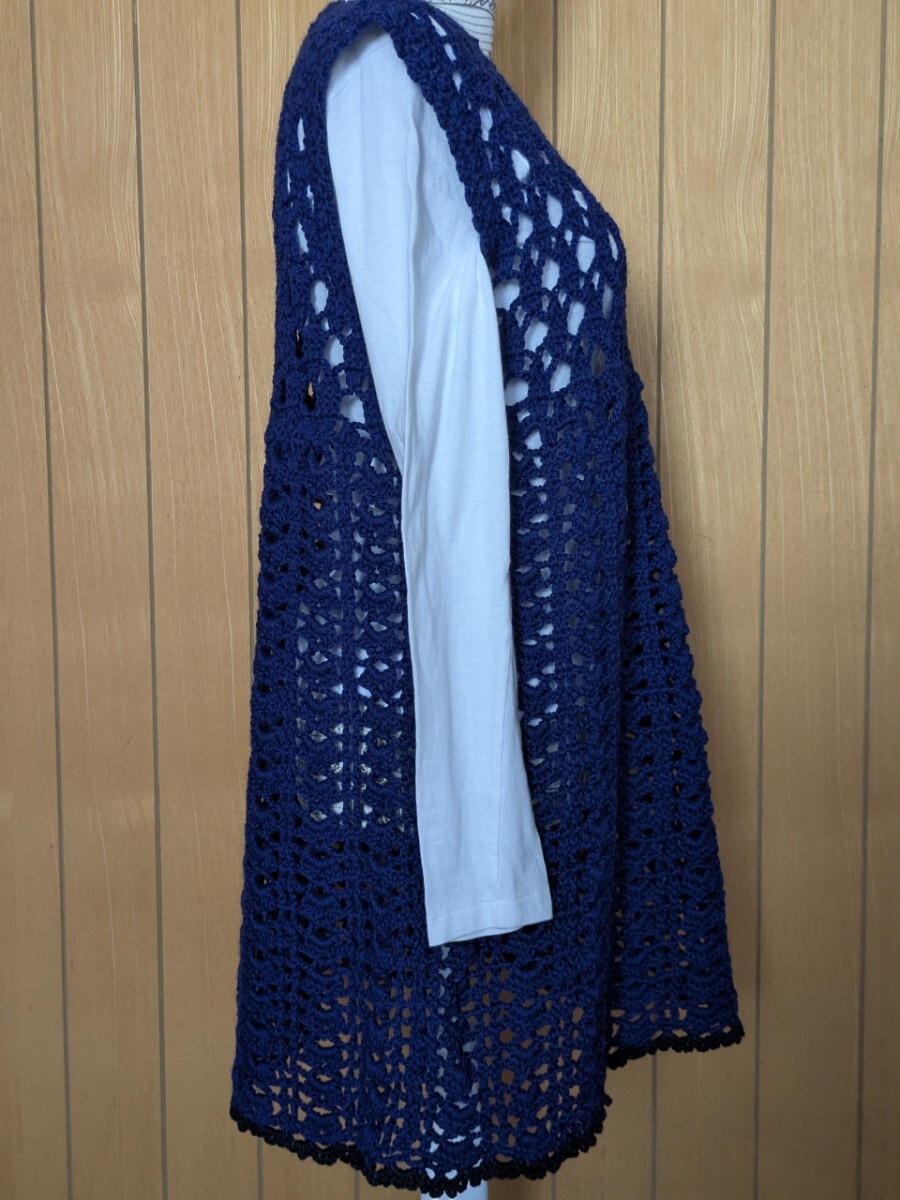 やや厚みのある総模様編みのロングベストです。裾は黒色で縁編み。着用するととても綺麗な模様が現れます。