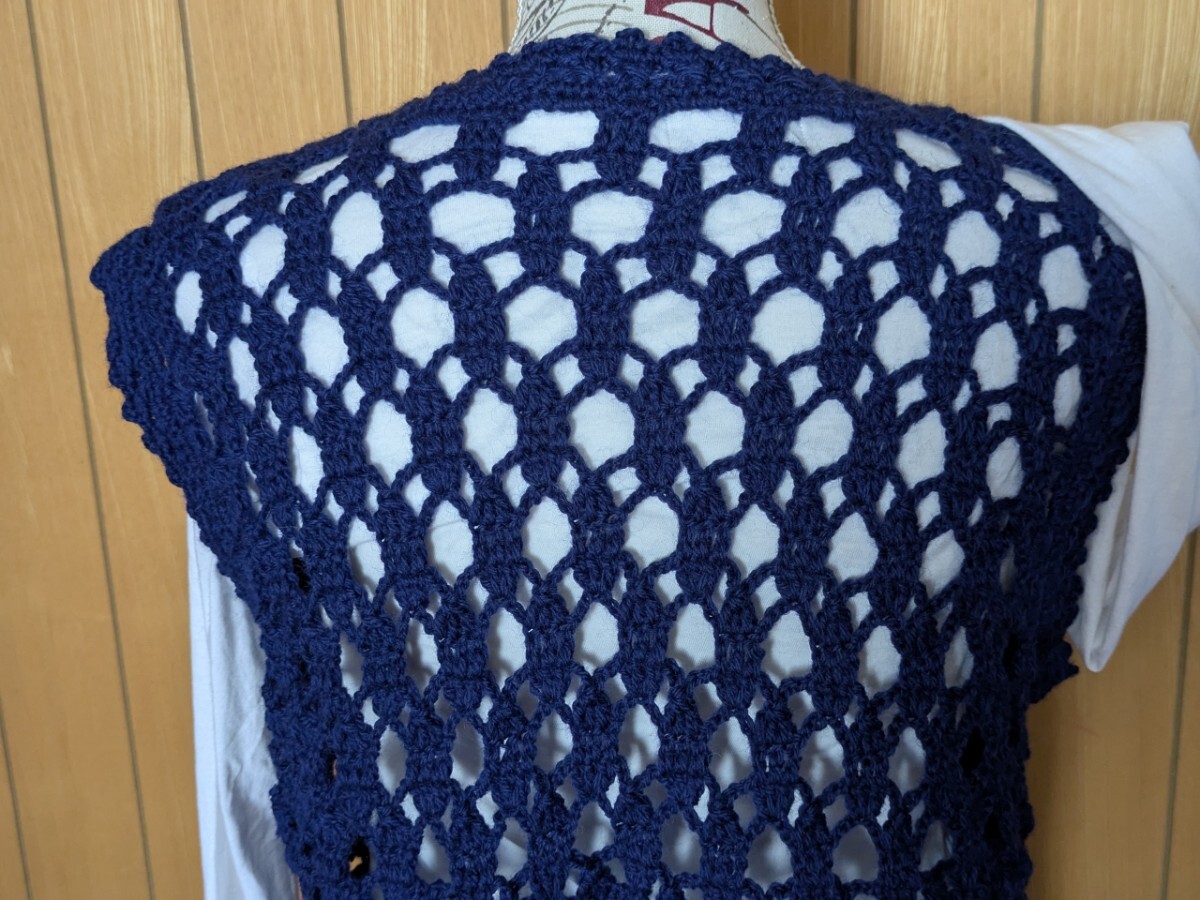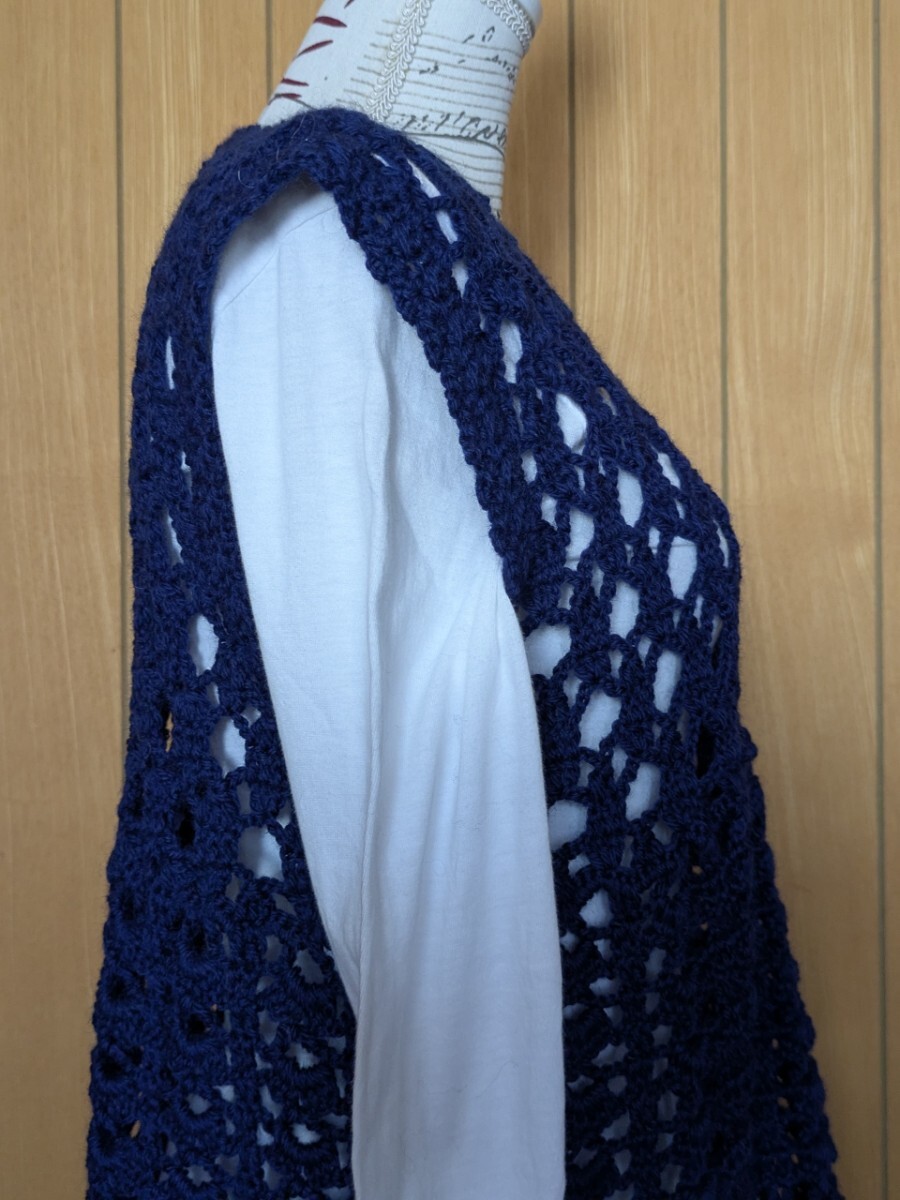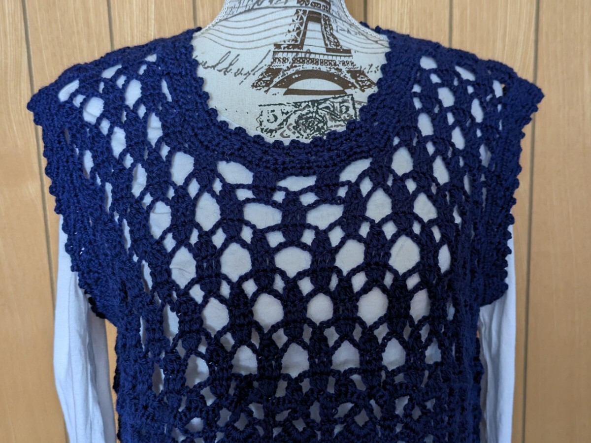 やや厚みのある総模様編みのロングベストです。裾は黒色で縁編み。着用するととても綺麗な模様が現れます。
