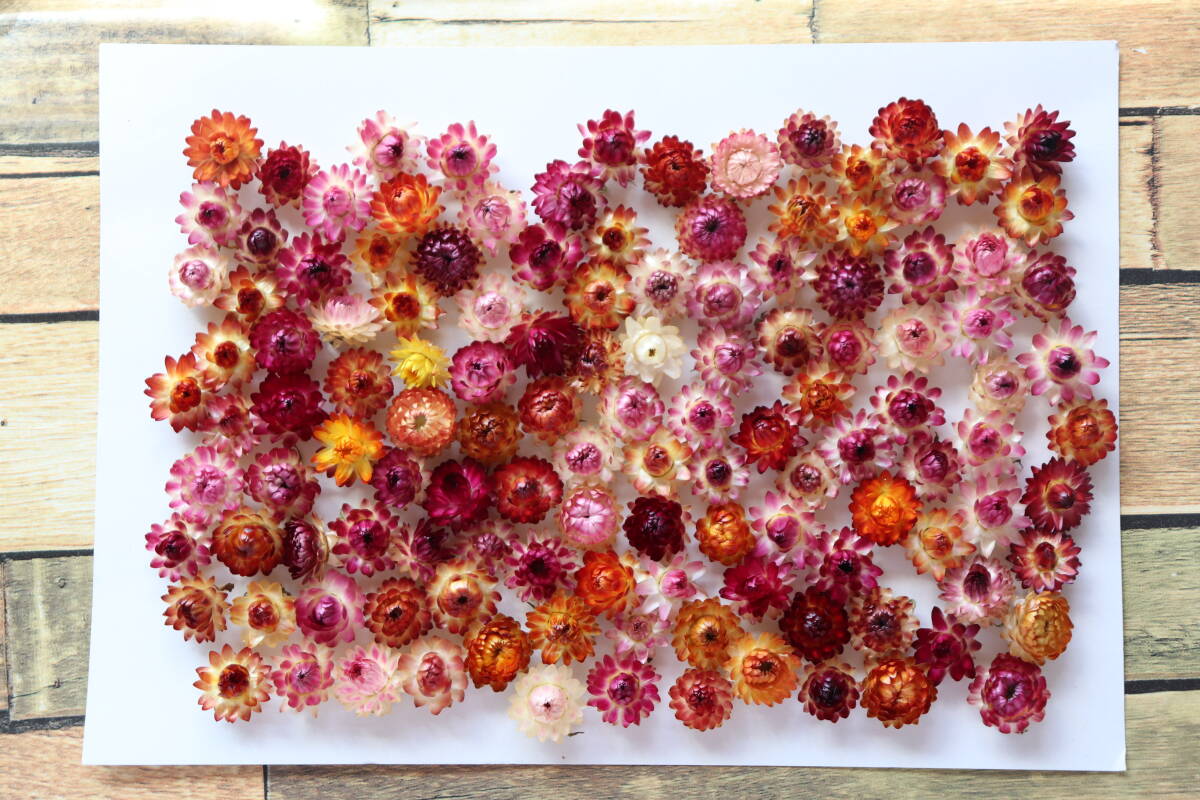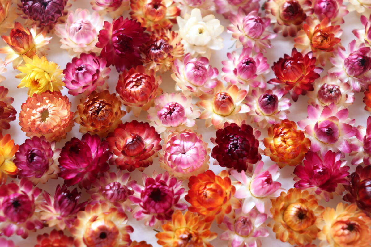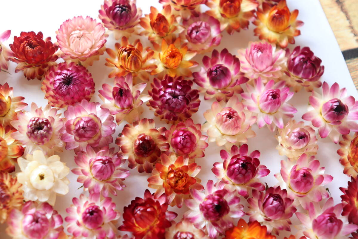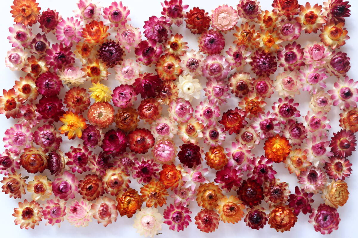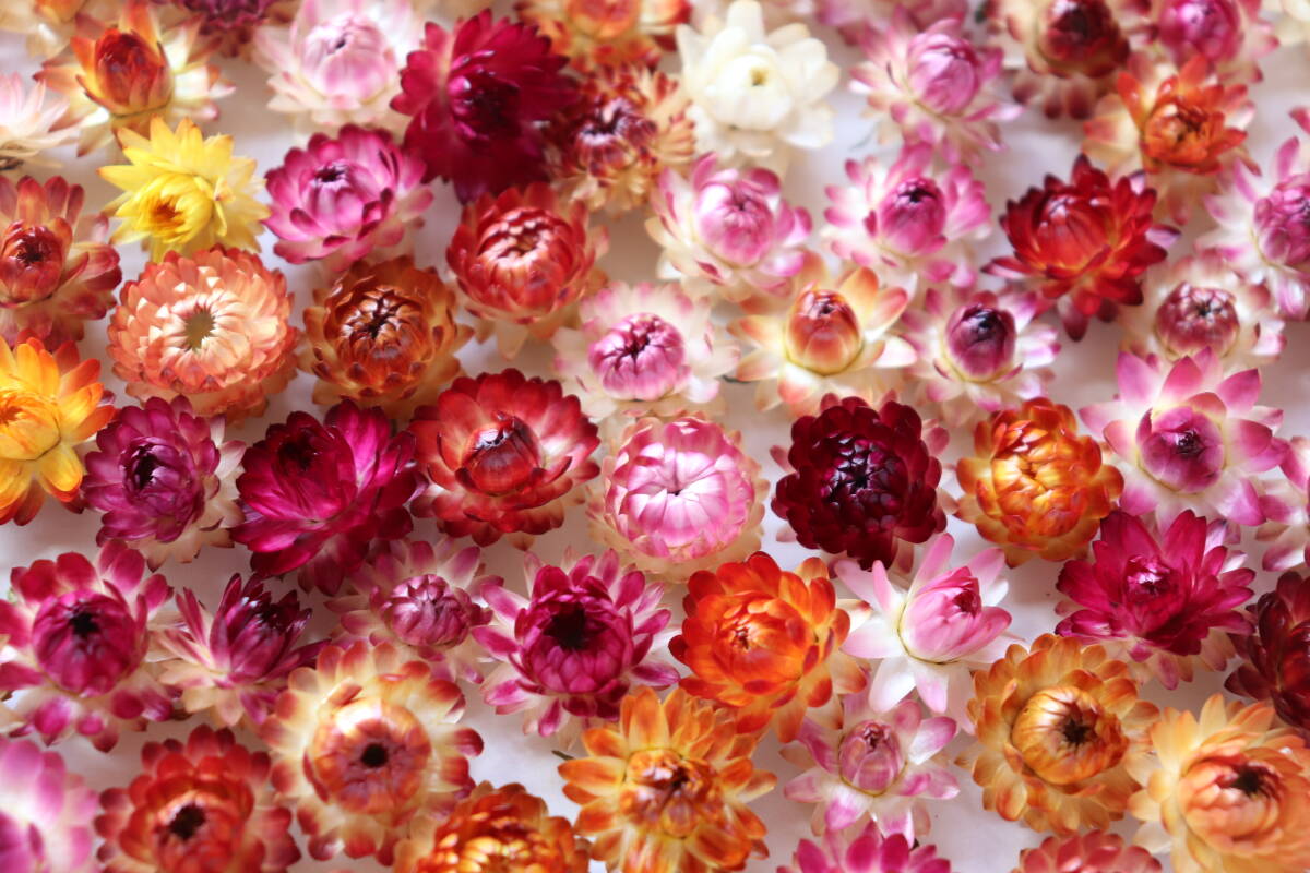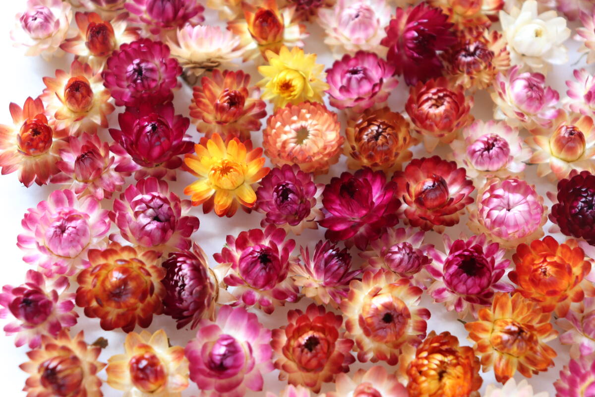 色とりどりの小さな帝王貝細工(ヘリクリサム)ヘッド125個セットです。