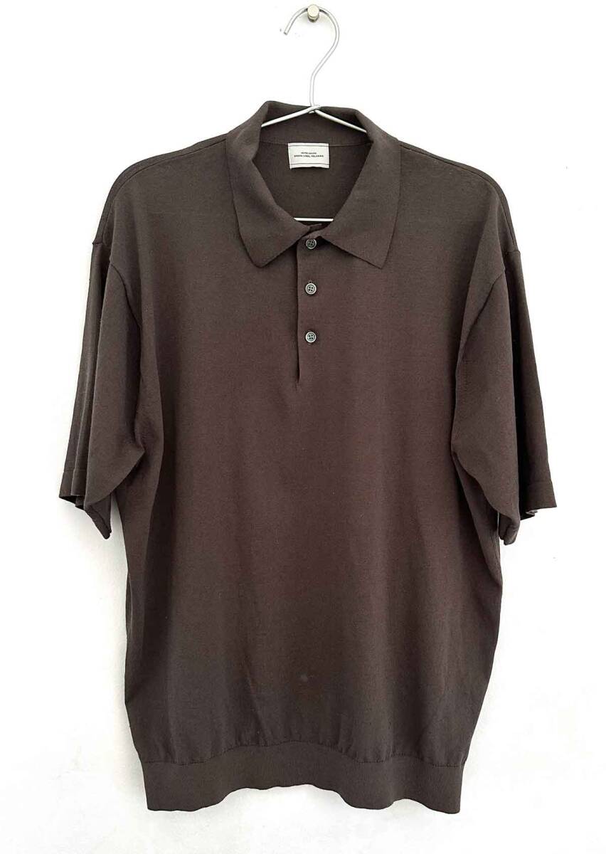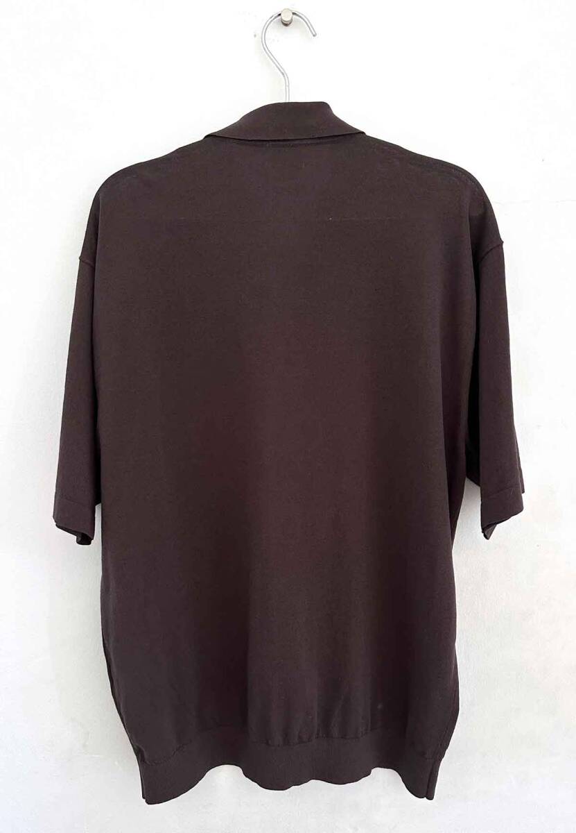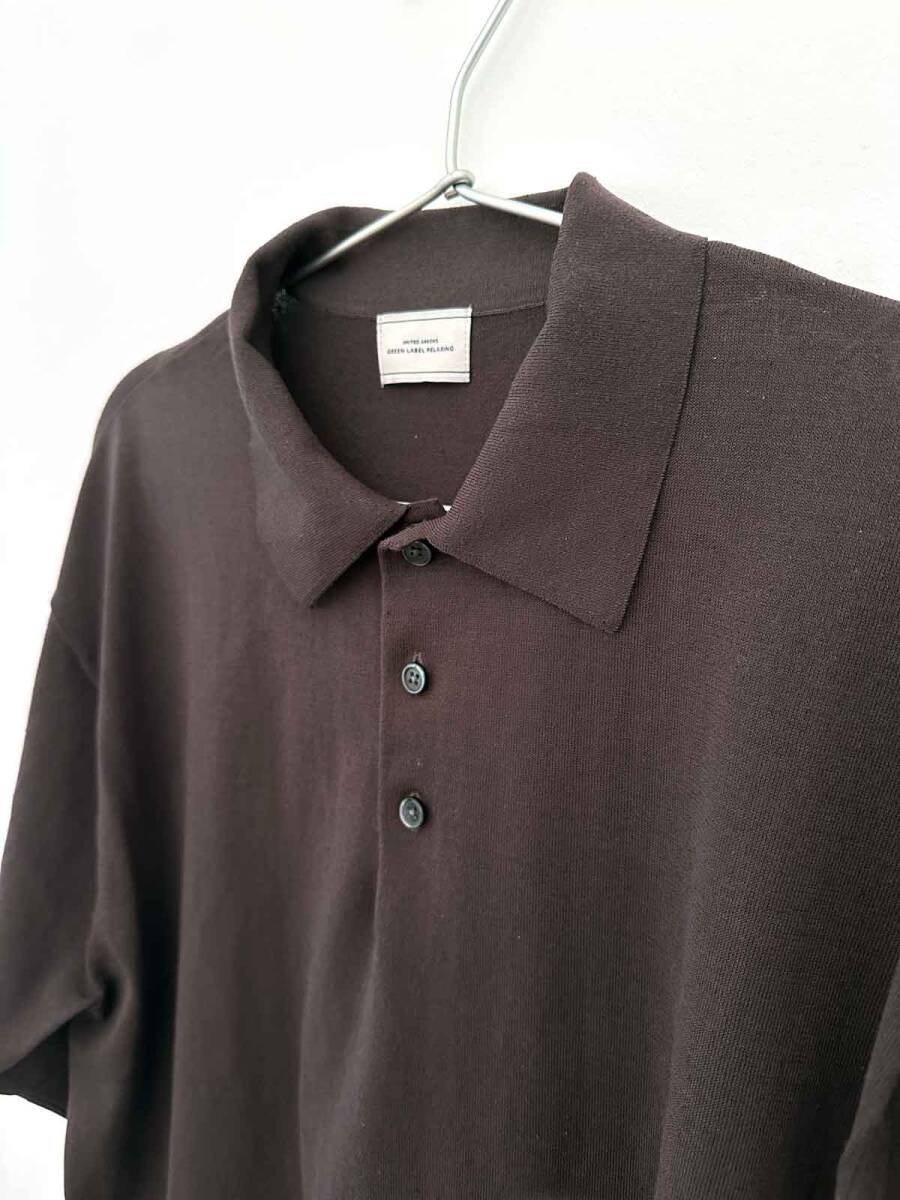 ユナイテッド・アローズ グリーンレーベルリラクシングのポロシャツです。色はダークブラウン、素材はリネン15%×コットン37%×ポリエステル48%となっています。非常にさらりとした着心地で、暑い夏にぴったり。サイズはLで、着丈68、身幅52cm程度。ゆったりとしたシルエットです。今シーズンもので、着用は1回のみ(1回洗濯しました)で、状態はとてもいいと思います。