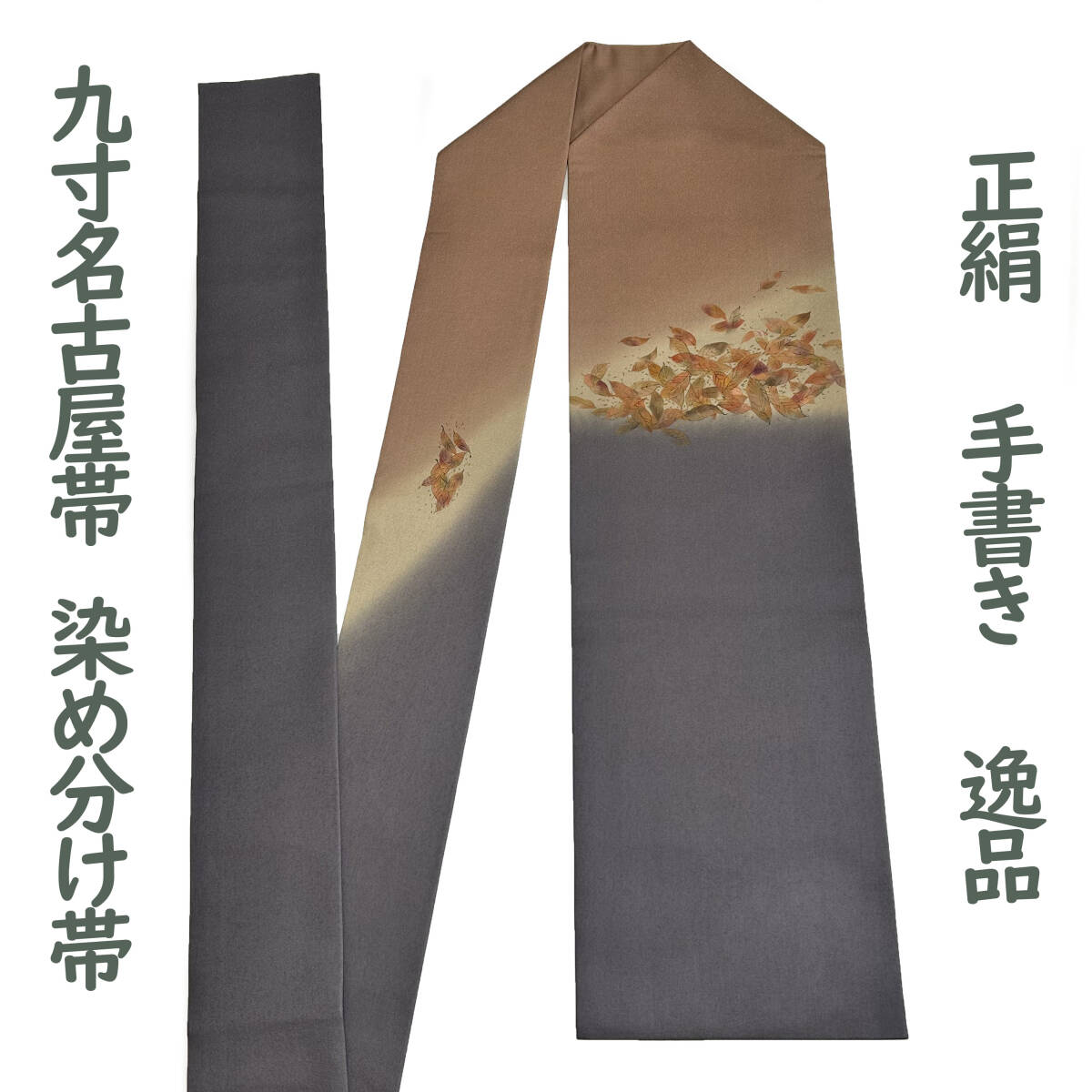 ブルーグレーやブラウンなど3色で染め分けられた地に、金彩加工を用いながら葉柄が手書きで描かれた、大変すばらしい逸品の九寸名古屋帯です。どうぞこの機会にご検討下さい!