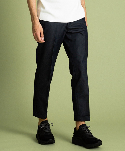 COOLMAXのデニム調素材を使用したパンツ。 COOLMAXは優れた吸水速乾性を持ち、ドライな着心地を提供してくれます。 汗をかきやすい夏はもちろん、湿気による体の冷えを防ぐため寒い時期にも使用できる優れた素材です。 デニムの見え方ですが、色落ちせず、同じ色合いを保ちます。若干身体から離れる細身のテーパードシルエット。 センタープレス入りの八分アンクル丈。 裾はダブル始末で下部に重みとアクセントに。 ウエストにはアジャストタブ付きでノーベルトでも。 今シーズン注目のローファーやダッドスニーカーとも合わせられる汎用性の高いアイテム。 |