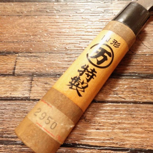 山形、丸万の銘が入っており、柄にはシールや値札が残っています。