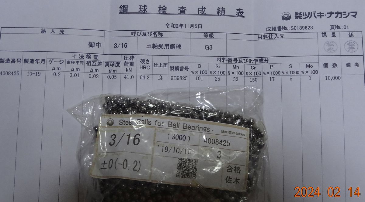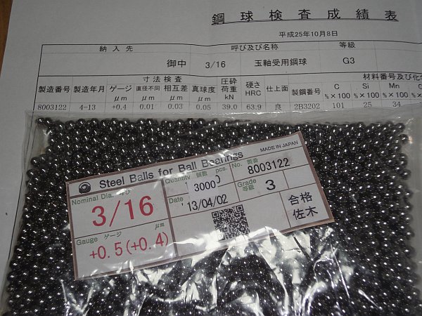 日本製G3等級 3/16in(4.76m/m) SUJ-2で10個140円 です。