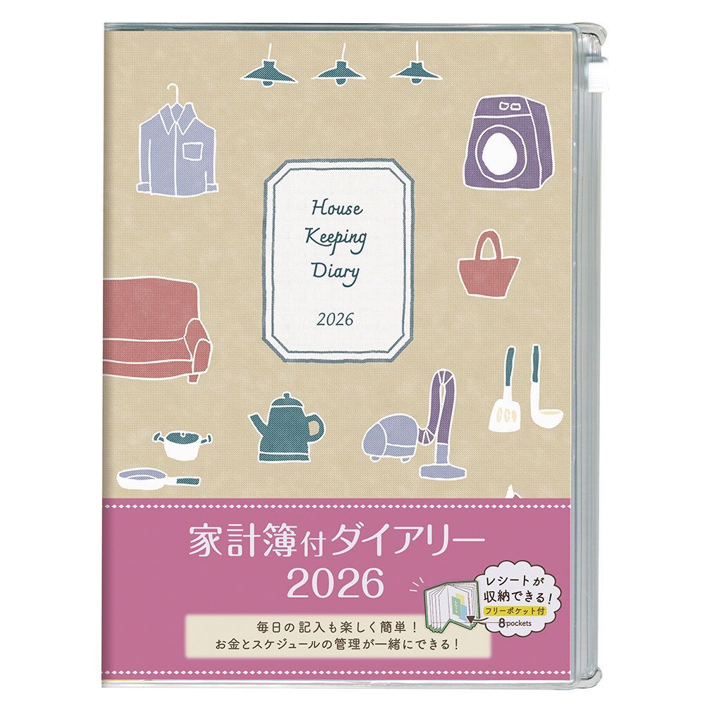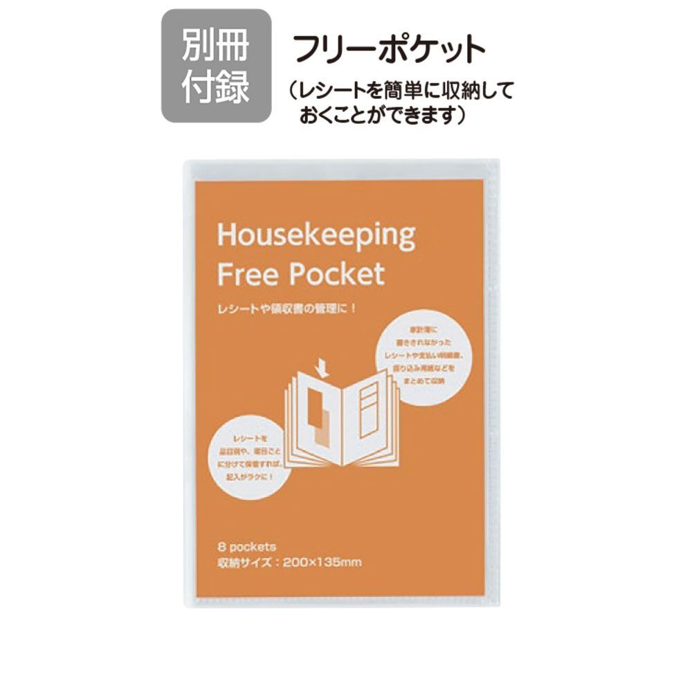 シンプルな構成で見やすく使いやすい家計簿ダイアリー。別冊のフリーポケット付きです。