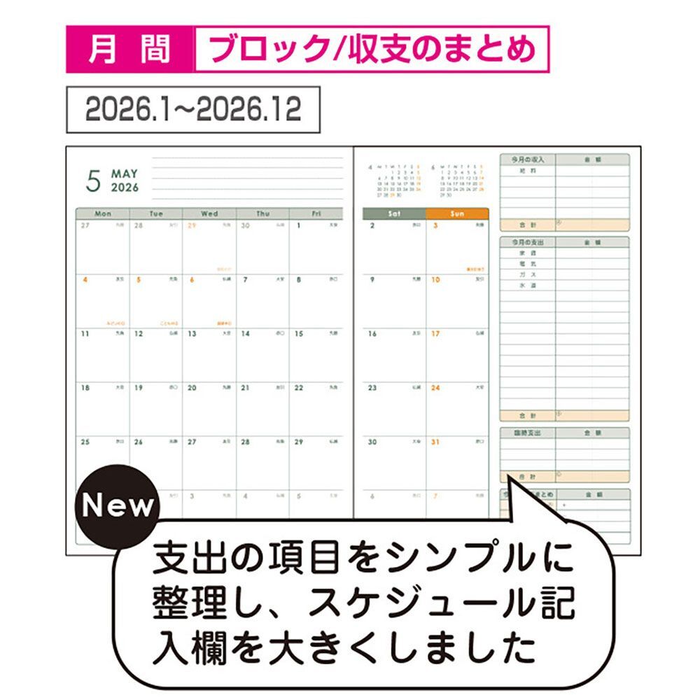 記入欄が大きく、予定と収支の照らし合わせがしやすい月間スケジュール。1ヶ月の支出ページで支出分類が8項目まで記入できます。レシート類を分類収納できる別冊フリーポケット付き