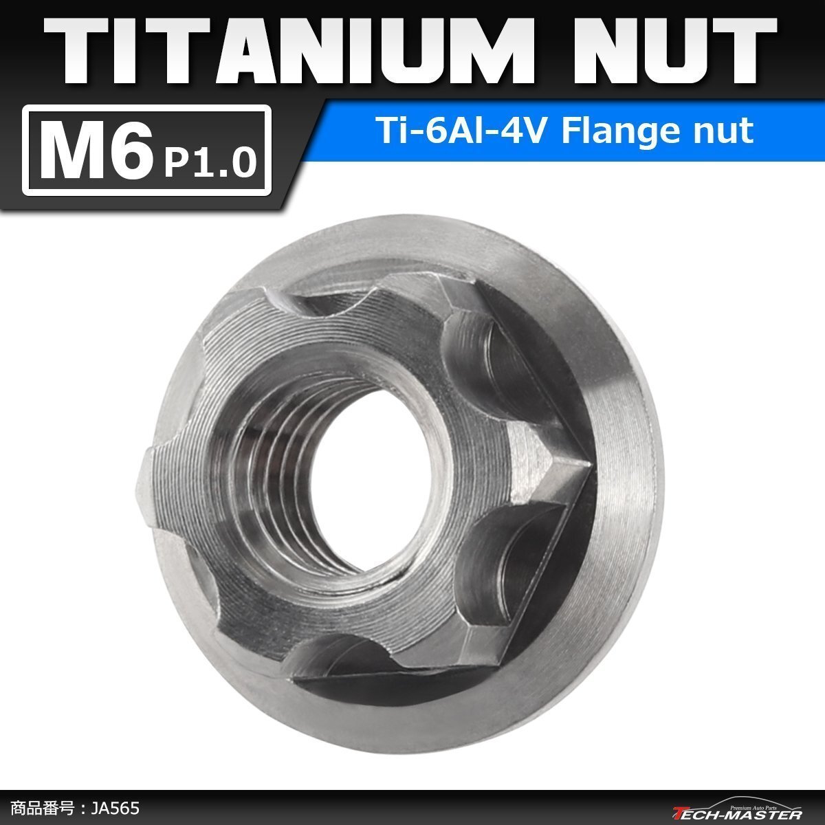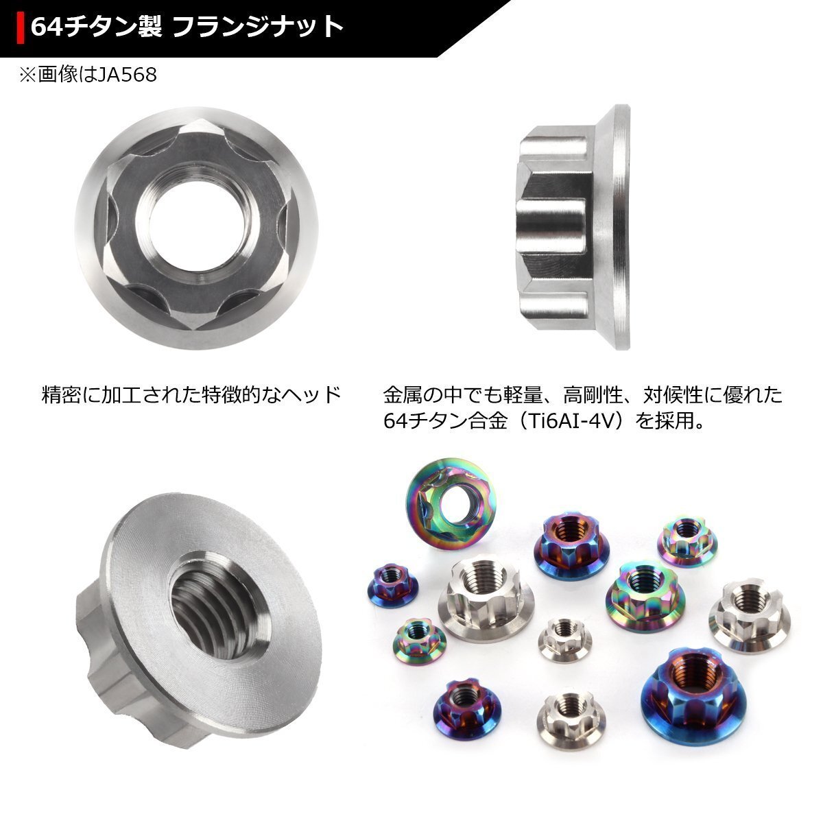 | 六角ナット アクスルナット フランジ付き 金属の中でも軽量、高剛性、対候性に優れた64チタン合金(Ti6AI-4V)を採用。 デザイン切削加工を施し、ドレスアップにも最適なナットです。 |