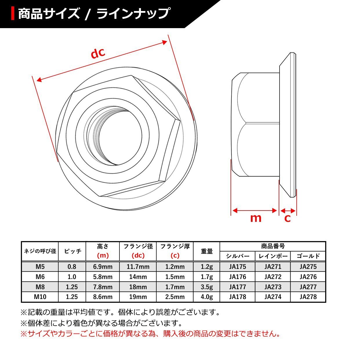 64チタン フランジ付き ナイロンナット(ゆるみ止めナット) 数量:1個売り 材質:64チタン 形状:六角ナット型、フランジ付き、ナイロンリング内蔵 適合工具:レンチなど ネジの呼び径:M5(詳細は画像に掲載) ピッチ:P0.8 適合車種:汎用タイプ。サイズ等でご判断ください。なお、適合車種に関しての回答は致しておりません。 商品カラー:シルバー ※サイズやカラーごとに価格が異なる為、購入後の商品の変更はできません。 また、ご購入数しかお取引ができません。 数量以上ご必要の場合は、ご入札前にご質問ください。 在庫がございましたら別途出品させていただきます。 |
