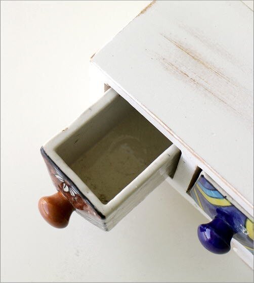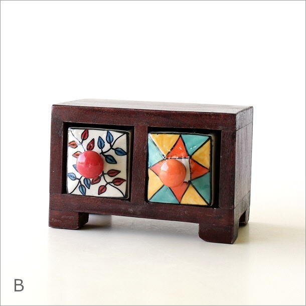| こちらのページでは【Bタイプ】のみの販売です 一つ一つ陶器の絵柄も変わった 楽しいミニチェスト インパクトのある絵のデザインは 小さくても存在感はたっぷり アンティークなホワイトとブラウンの2タイプ 小さな引き出し2個の可愛いチェスト 棚に置くとアクセントにもなる 可愛い存在です 商品名:陶器の2引出しミニチェスト 商品番号:tom4258 全体のサイズ(cm):幅15×奥行8.5×高さ9※ツマミは含みません 引出し内のサイズ:幅4.5×奥行7×深さ5 材質:天然木 陶器 重量:760g 生産国:インド ※引き出しの柄は様々で組み合わせはお選びいただけません ※木枠や陶器の塗り斑や引き出しの欠け・ヒビ(貫入)等がみられます。ご理解の上ご検討ください ※商品の特性上、僅かにがたつきある場合がございます ※引き出しはストッパー付きです |