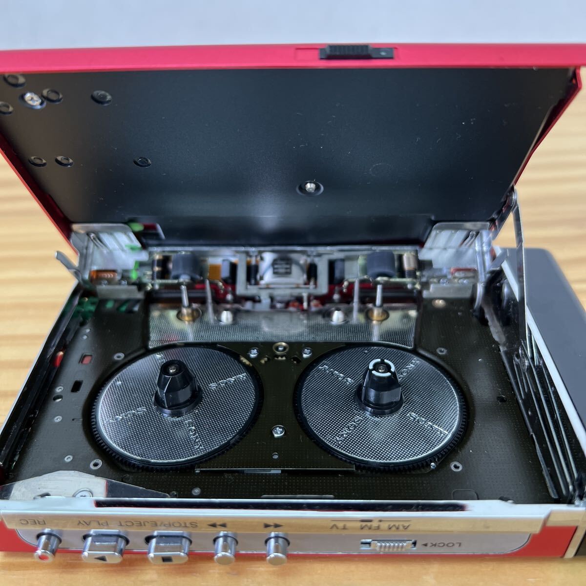 単三電池を一個入れて、通電確認できました。ラジオAM/FM受信し、イヤホンでの音出し確認出来ています。その他の動作未確認の為、ジャンク扱いでお願いします。電池、イヤホンは付いていません。