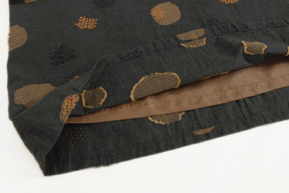 チャコールグレーカラーのベースに、同配色やブラウンカラーのサークル状のジャガード織りがほどこされています。