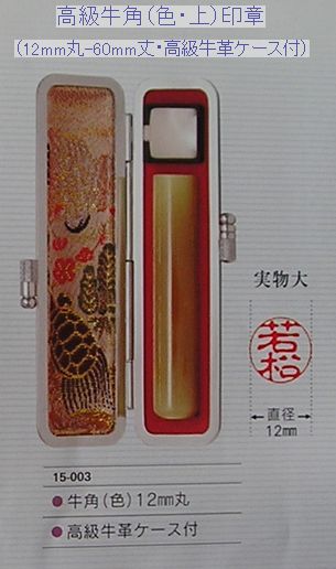 | オランダ高級牛角(色・上)12mm丸-60mm丈(銀行印・認印)¥9,320 彫刻・高級牛革ケース付。 納期・7 日 | ||