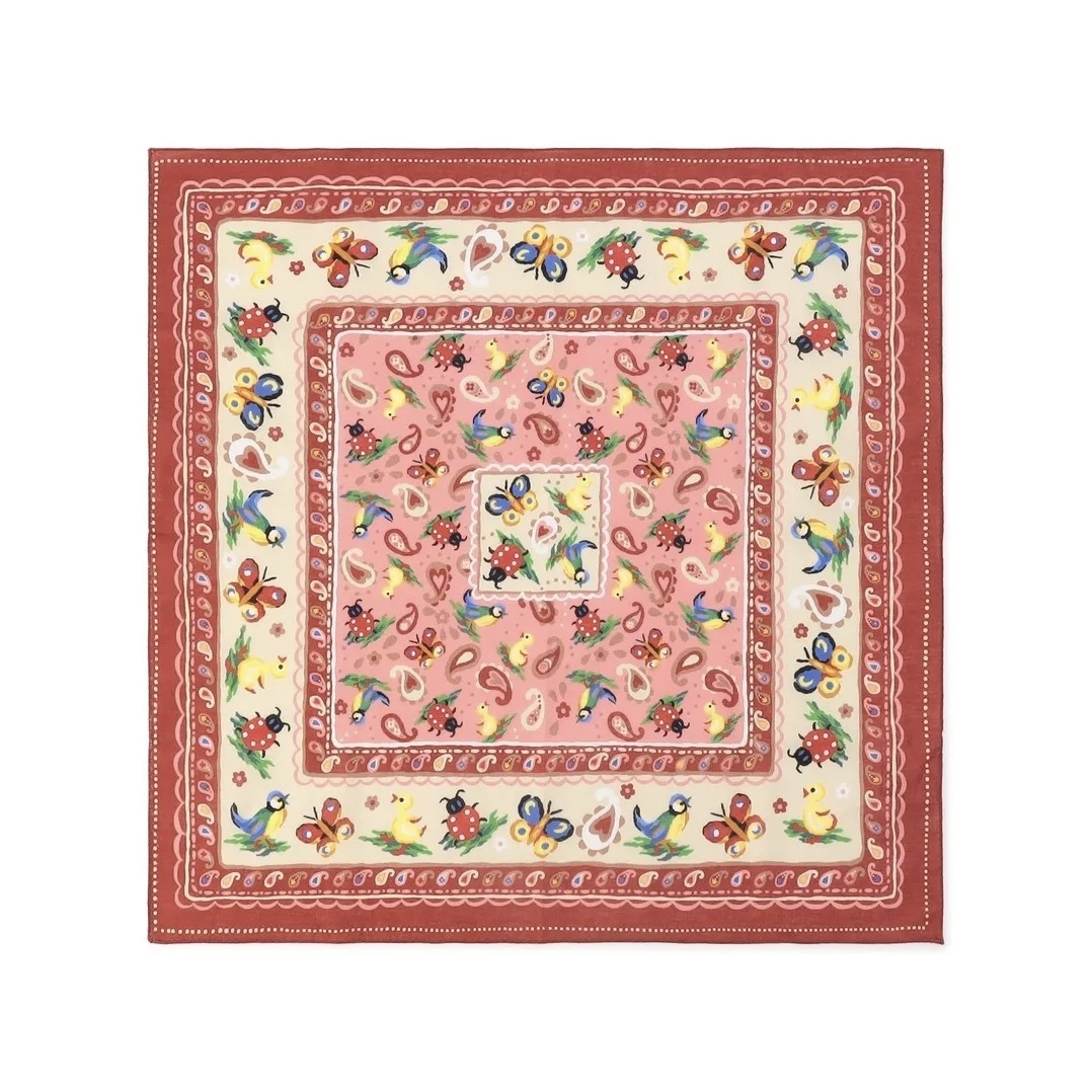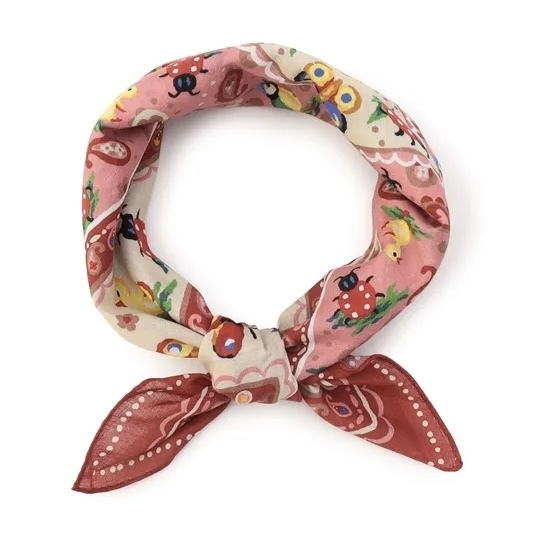 メリハリのあるカラーリングが華やかな『ハイジペイズリー』のバンダナです。デザインを新たに描き起こして、より愛らしく、より優雅な雰囲気にまとめました。襟元にあしらうことで、コーディネートのアクセントとして活躍。バッグのハンドルに巻き付ければ装いのポイントになります。かわいらしさとエレガントさを兼ね備えた1枚です。