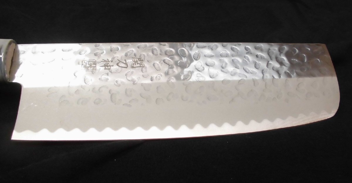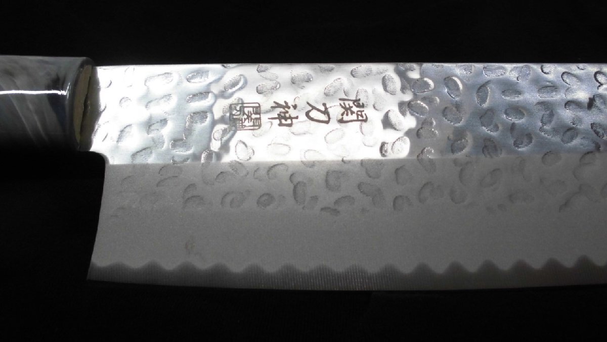 ◆刀身の表面に打ち込まれた槌目模様の凹凸は、手作りの味わい深さを感じさせる美しい仕上げです。また、切った物が包丁に付着しにくいという実用性も兼ね備えています。