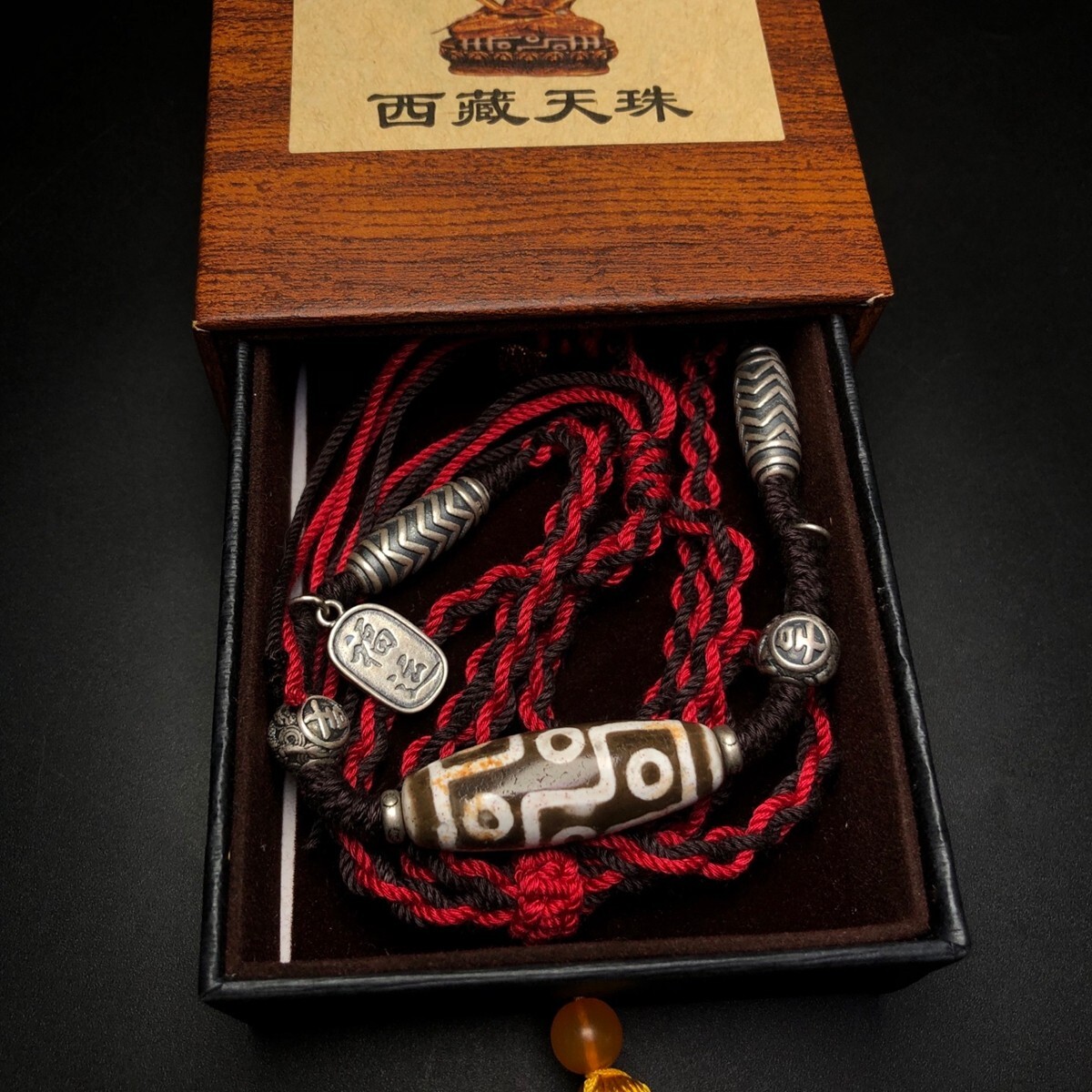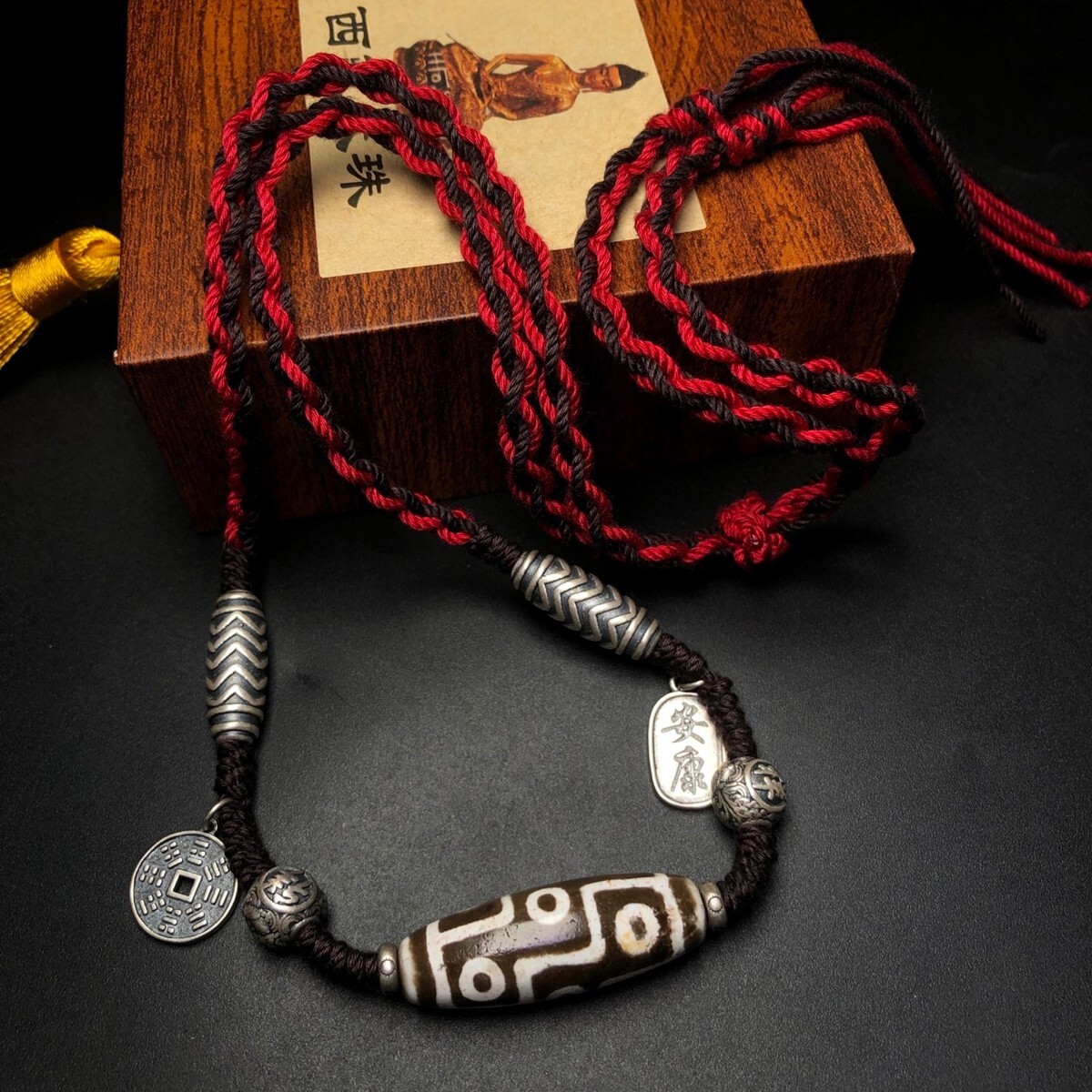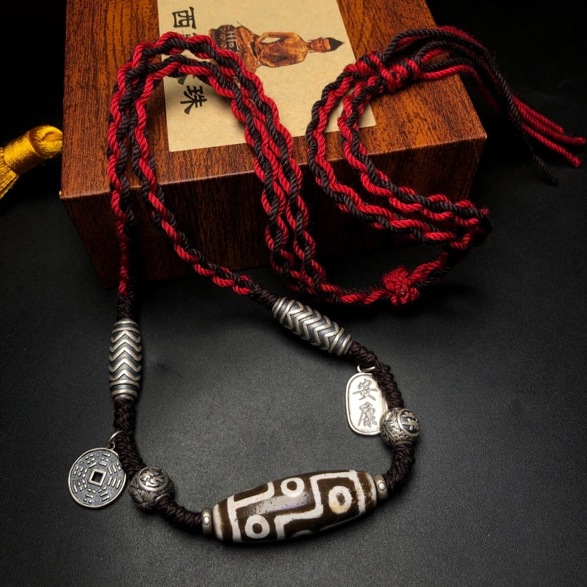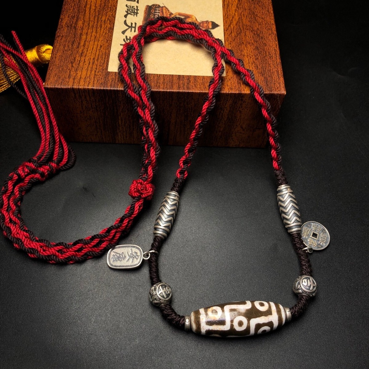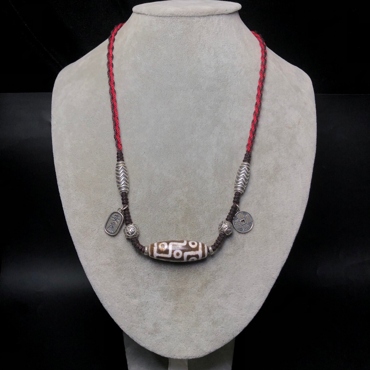 「時代物 藏區 瑪瑙彫り 九眼天珠 項鏈 純銀飾り」極細工 裝身具 賞物 中国古美術 旧蔵出