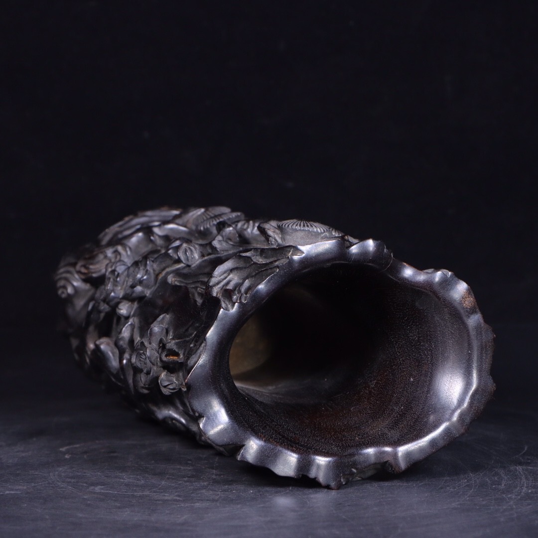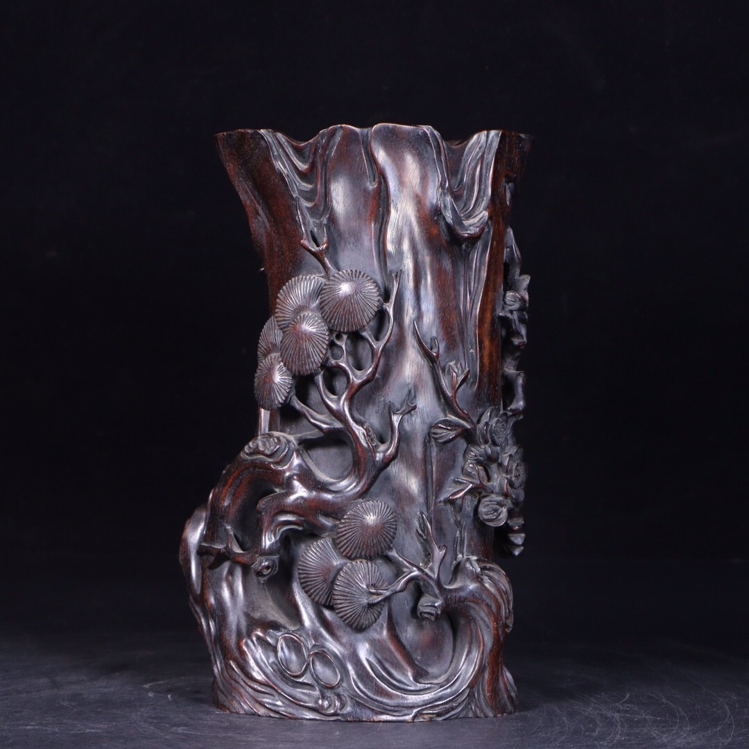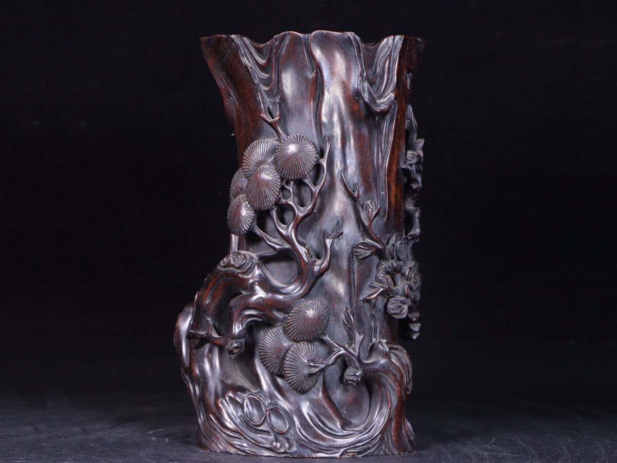【瓏】老紫檀の木彫 松竹梅蘭 樹パイル形花挿 清時代 極細工 手彫り 置物 擺件 古美術 骨董品 蔵出
