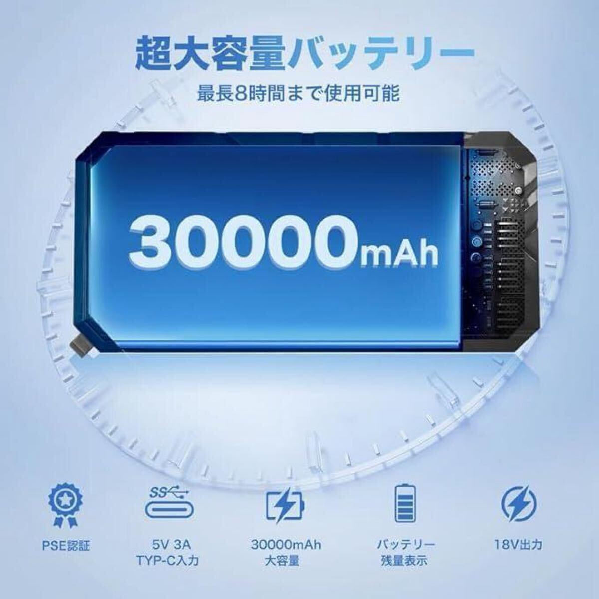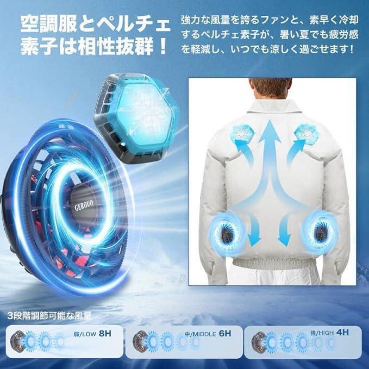 【大容量バッテリーと安全性】30000mAhの大容量バッテリーを搭載した空調冷却服。PSE認証済みで安心してご利用いただけます。長時間の冷却をサポートします。使用する際は、まずパワーバンクの電源を入れ、接続線の電源を3秒間長押しして使用を開始します。 【調整可能な風速と持続時間】3段階の風速調整機能付き空調服。低速で8時間、中速で6時間、高速で4時間の連続使用が可能。作業環境に合わせて柔軟に設定できます。