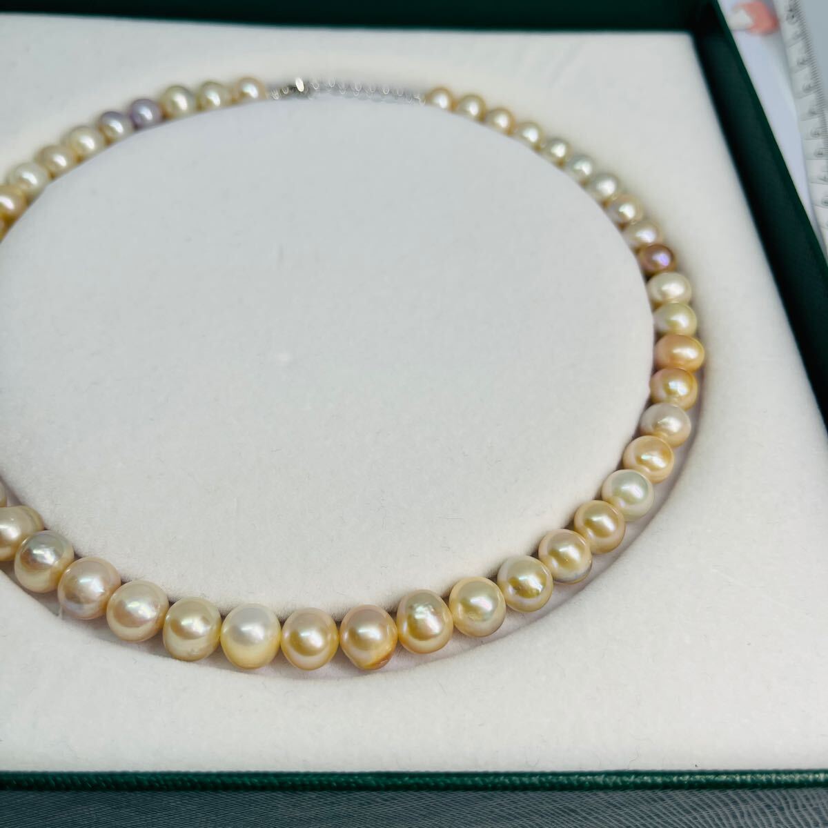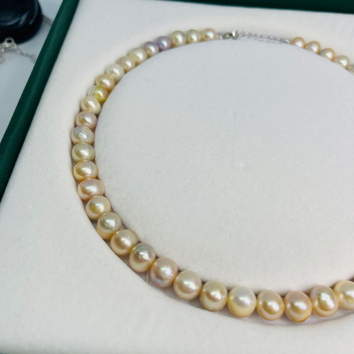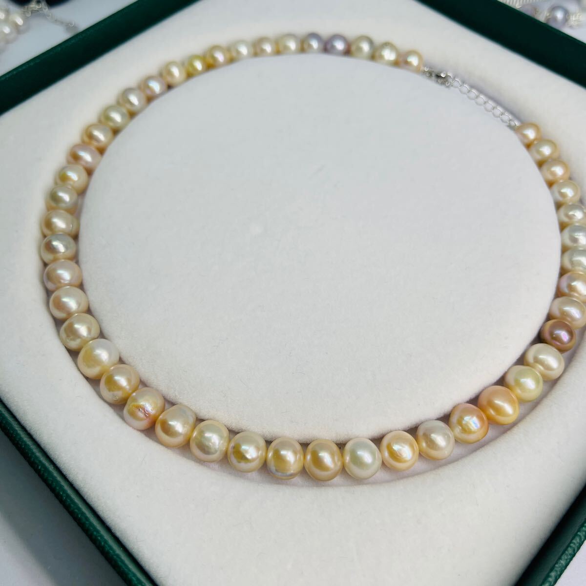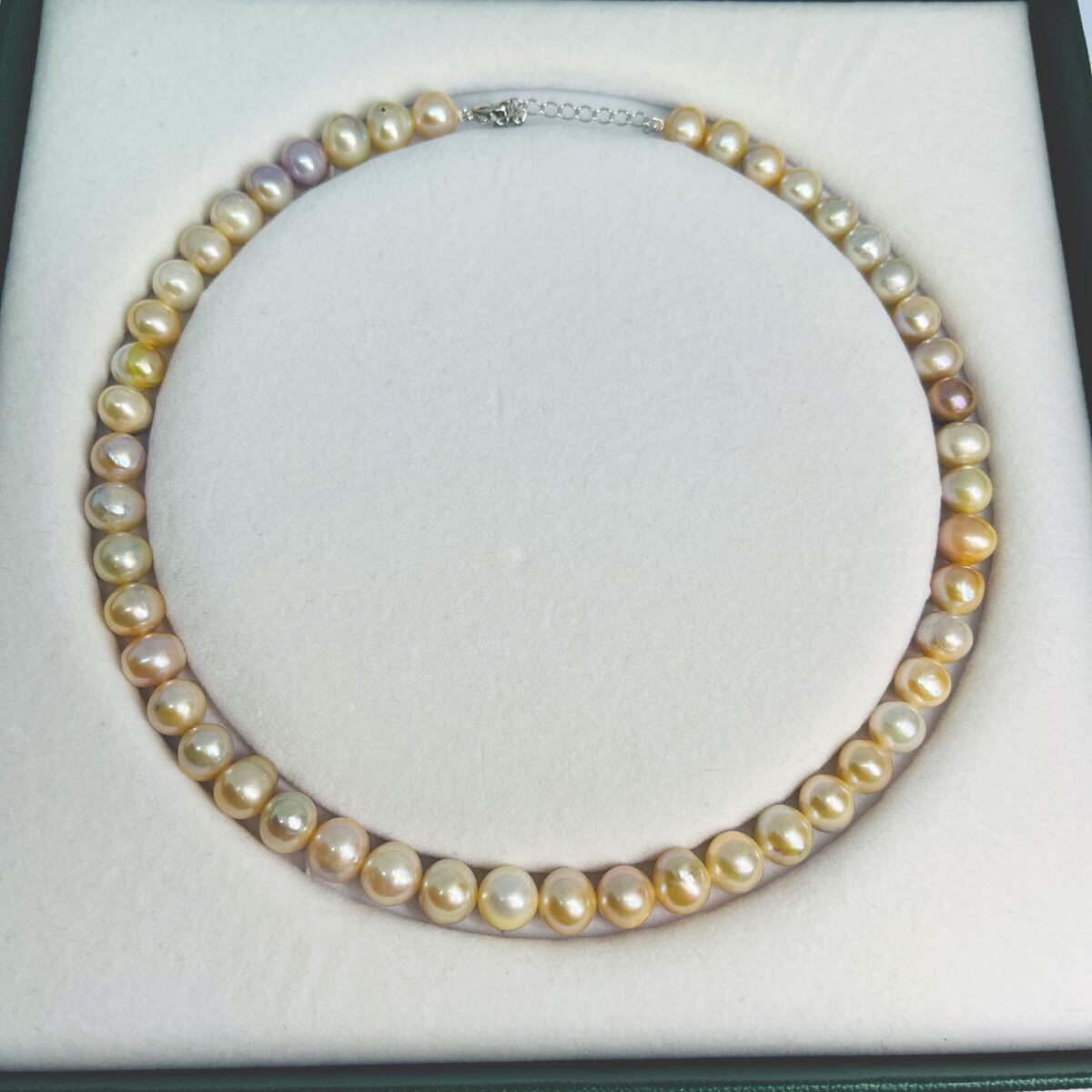 淡水パールは核がないため、丸い近い形で育つものは非常に稀。バロック型といわれる、いびつな形のものが一般です。しかも7-9mmの大きさになるまでは5~6年もの長い年月がかかります。