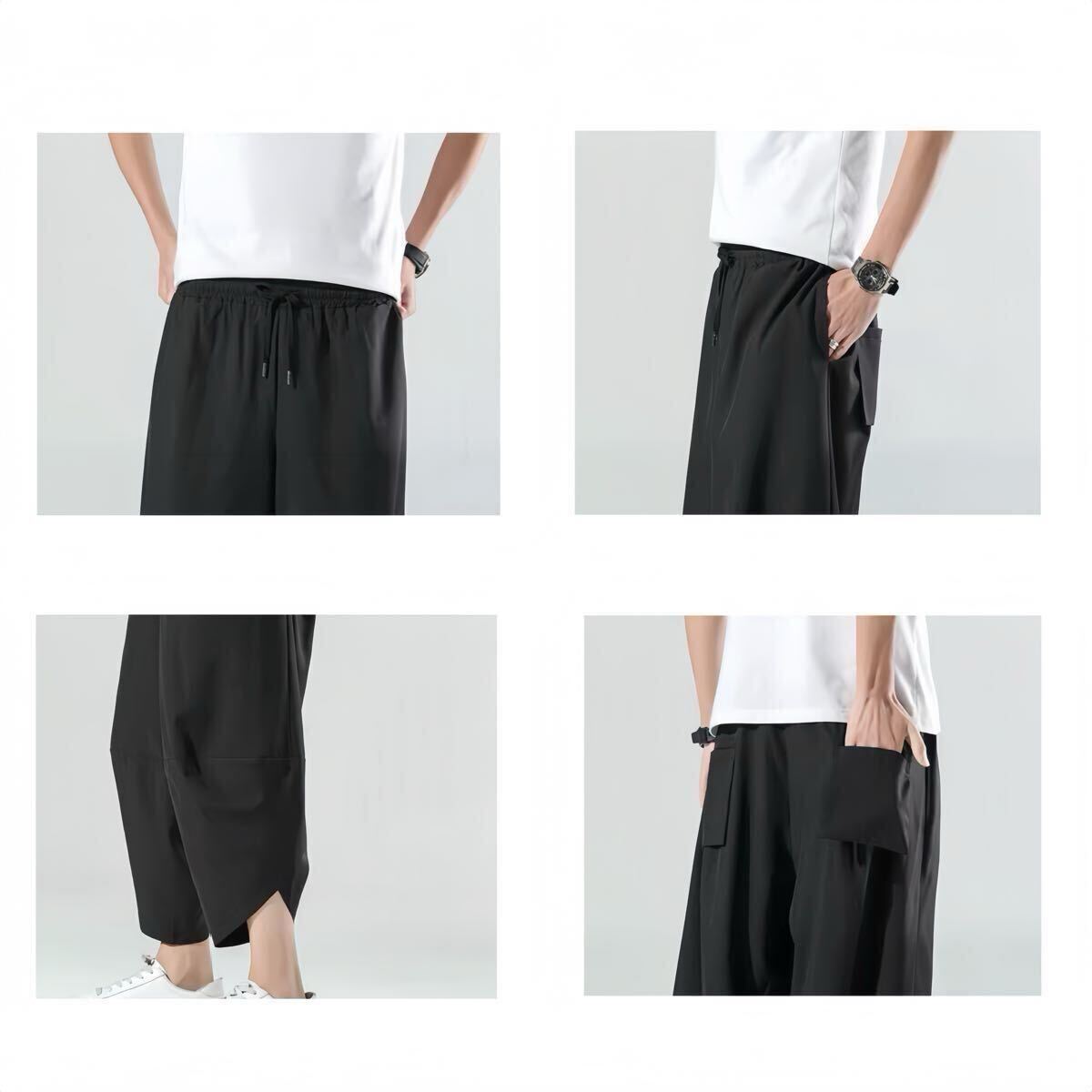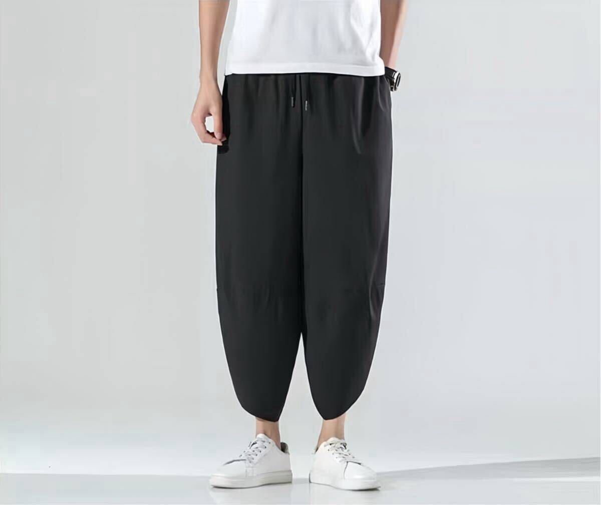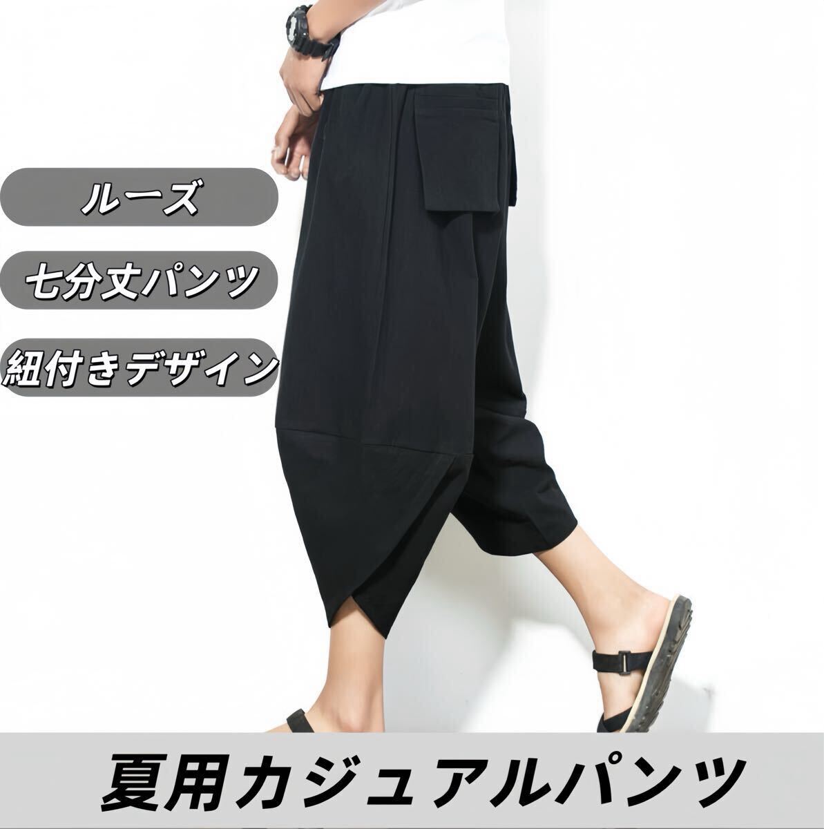 夏用ゆったり七分丈パンツ ユニセックス 軽量 速乾 通気 吸汗 カジュアル ドローストリングパンツ アラジンパンツ 綿麻風 ブラック