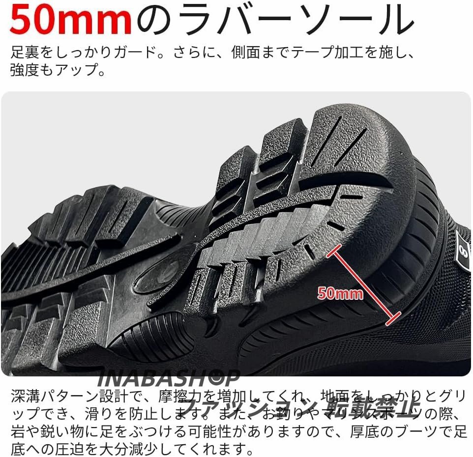 靴底は「50mm」も分厚く、耐久性のあるラバーソールです。深溝パターン設計で、摩擦力を増加してくれ、地面をしっかりとグリップでき、滑りを防止します。また、お釣りやマリンスポーツの際、岩や鋭い物に足をぶつける可能性がありますので、厚底のブーツで足底への圧迫を大分減少してくれます。
