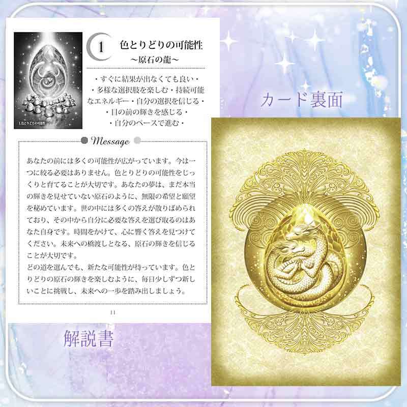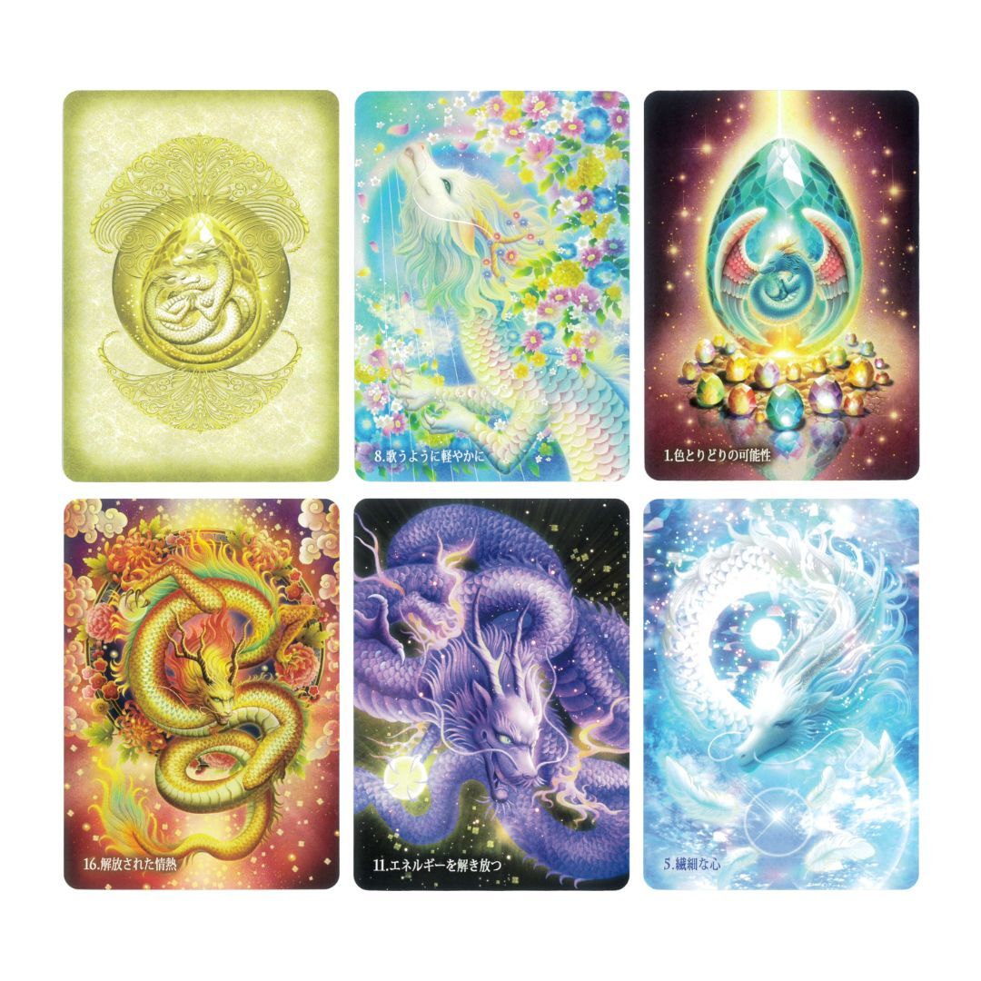 全40枚のカードに表された龍神たちは、実に奥深い表情をたたえていて、個性豊かな40の龍神それぞれのメッセージがしたためられています。