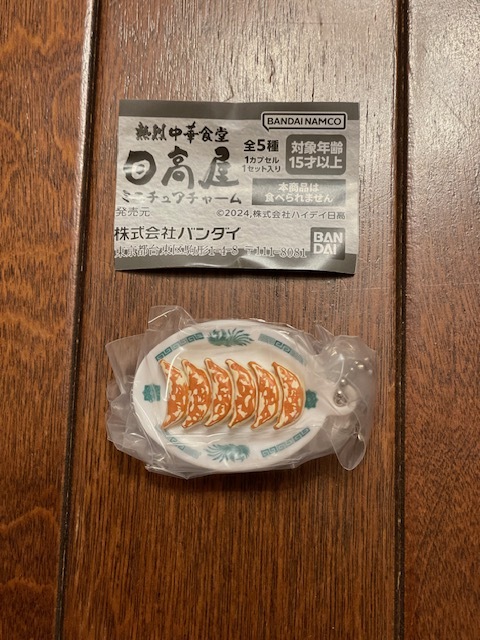 日高屋ミニチュアチャーム全5種のうち「餃子」になります。400円ガチャだけあって、とても可愛らしくデフォルメされたフィギュアになります。