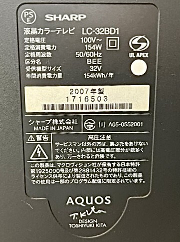SHARP シャープ 液晶テレビ LC-32BD1 32V型 32インチ 2007年製 B-CASカード・リモコン付き 動作品 中古 引取可 横浜市