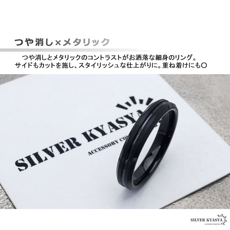 つや消しとメタリックのコントラストがお洒落な細身のリング。サイドもカットを施し、スタイリッシュな仕上がりに。重ね着けにも○