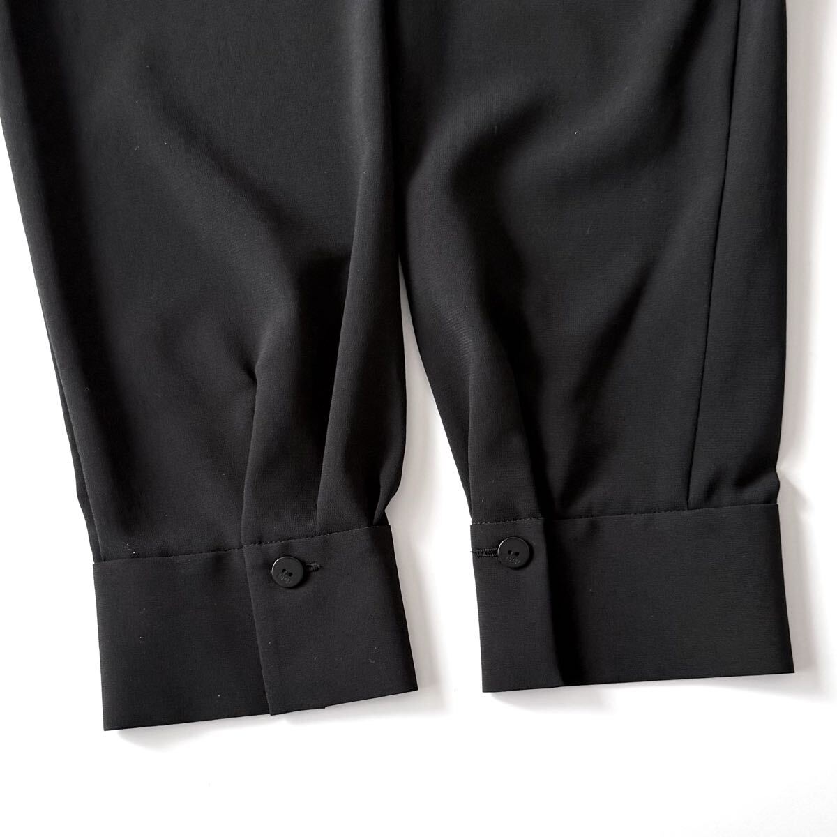 透け感のあるシフォン生地で軽やかな印象ながら、タキシードストレッチのパンツやバロンスカートと合わせて、きちんとしたシーンにも活躍します。