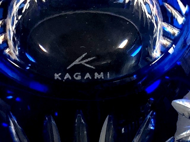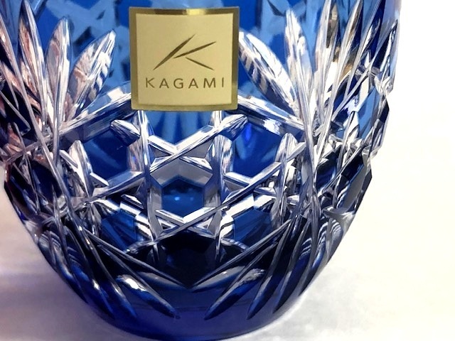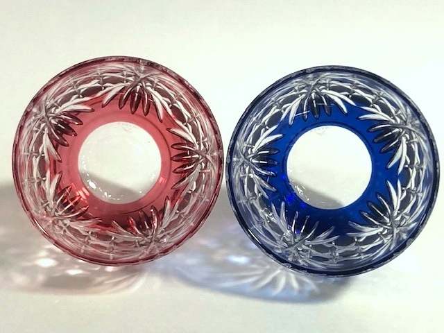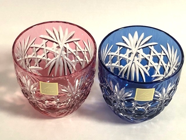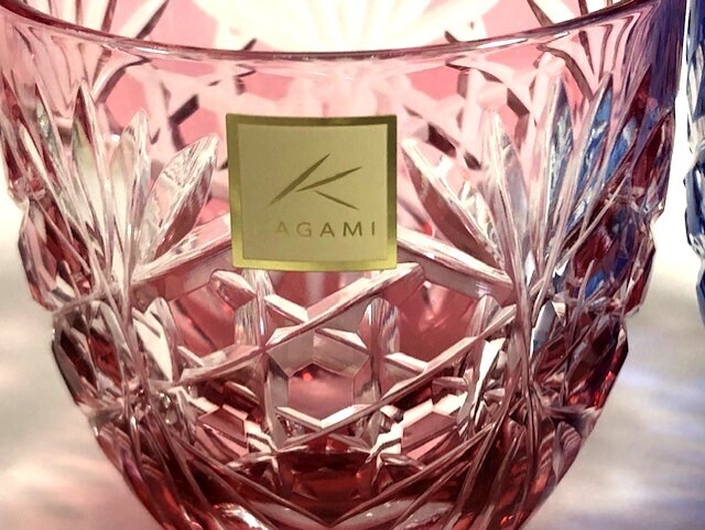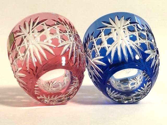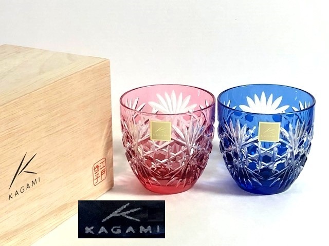 ◎KAGAMI カガミクリスタル 赤・青色被せ切子 ペア冷酒杯 懐石杯 江戸切子 六角籠目紋◎木箱付z66