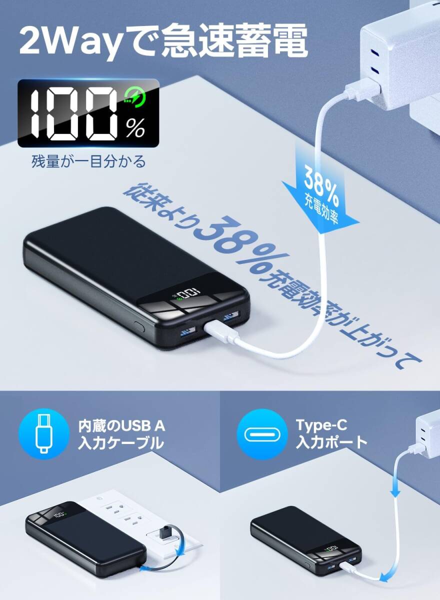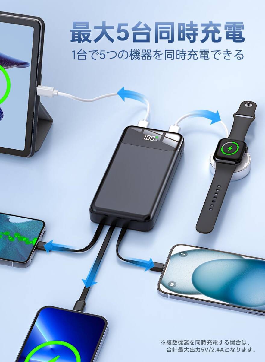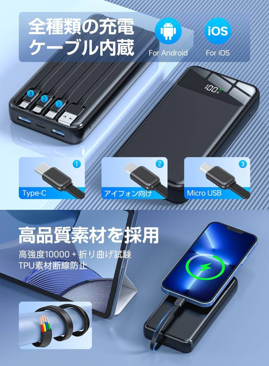 • 【急速充電可能なポート・4種類ケーブル内蔵】最大5V/2.4Aで急速充電可能USB-A出力ポートを搭載することで、通常の5W出力に比べ2倍以上の速度で充電することができます。3種類の内蔵出力ケーブル(Type-C&ライトニング&micro USB)+二つの出力ポート(USB-A1&USB-A2)で、最大5台のデバイスの同時充電が可能、コンセントのない場所でも手軽に充電できるため、安心して出かけることが可能。畜電可能な充電ケーブル(USB-A入力)を内蔵することで、別途充電ケーブルを持ち運ぶ必要がなく持ち物を少なくし簡単に充電することが可能で、完全なケーブルレスを実現。ケーブルを忘れたときも充電ができないなんて心配はありません。または、本体にケーブルがすっきりと収納できるので、カバンの中でケーブルが絡まったり断線することを防ぎます。