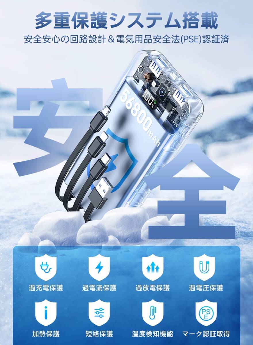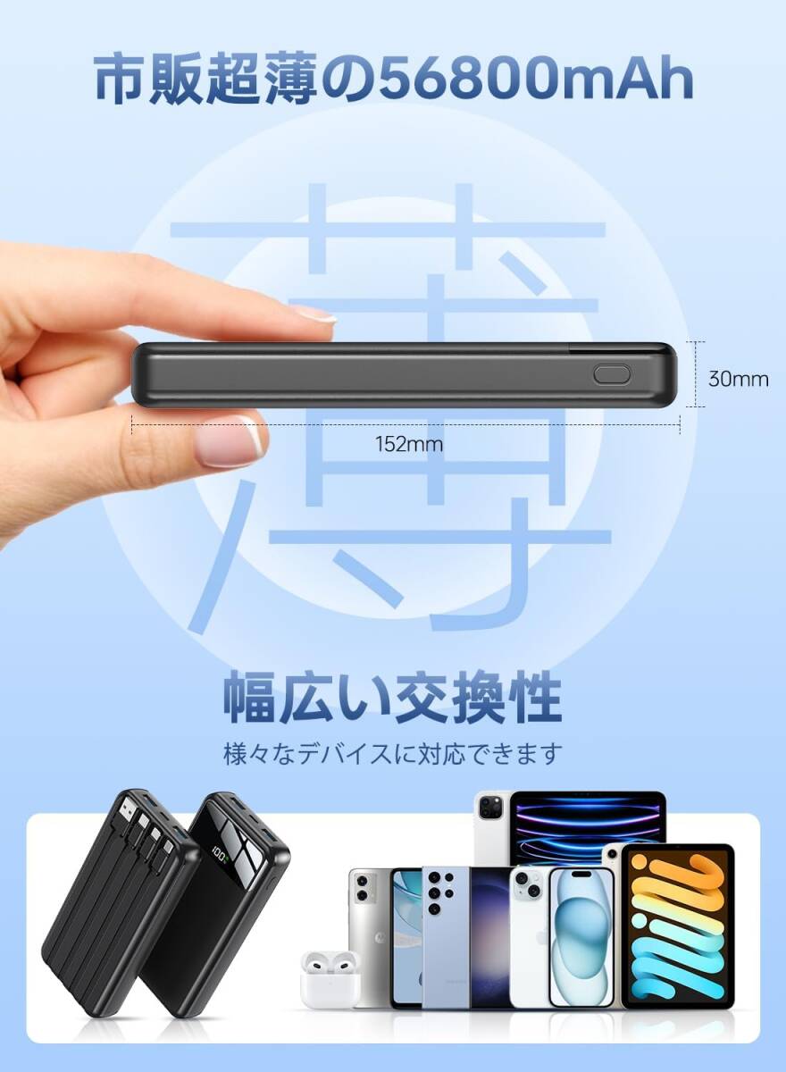 モバイルバッテリー 大容量 56800mAh 【4つのケーブル内蔵&五台同時充電】 急速充電 2.4A出力対応 LCD残量表示 PSE技術基準適合