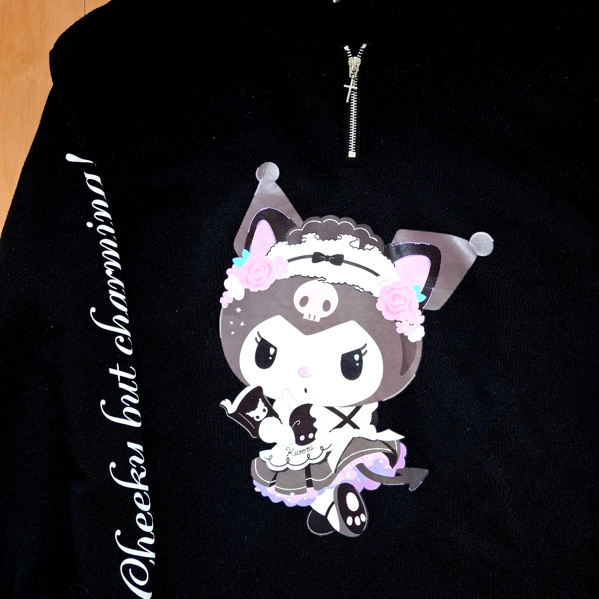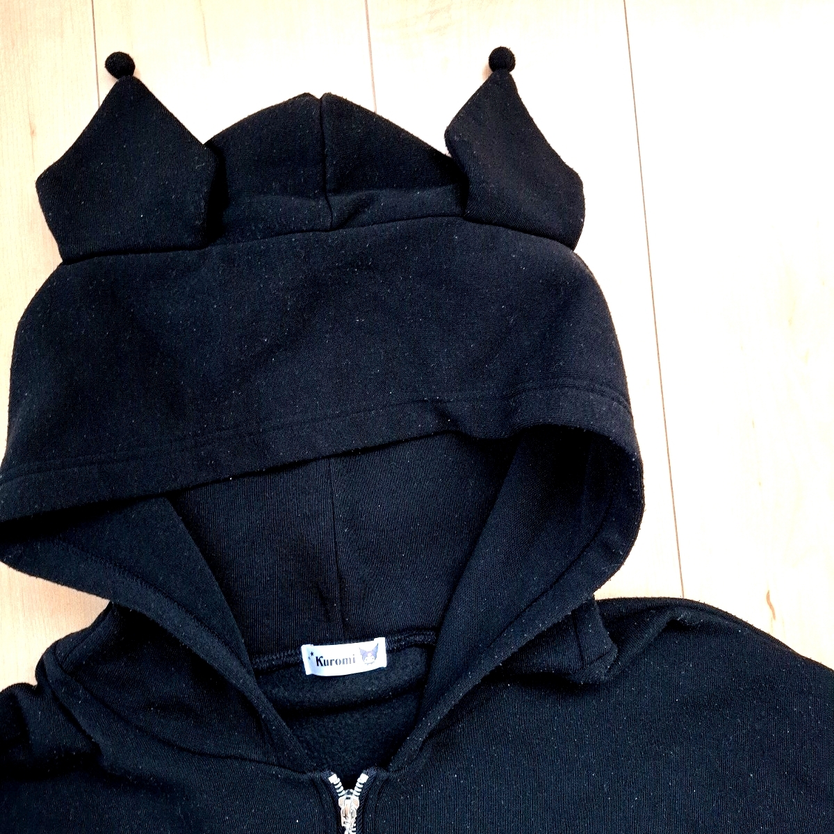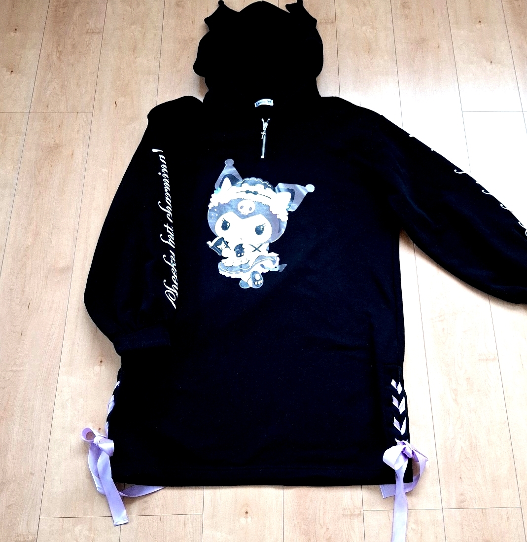 フード部分にはクロミの耳がついていて、袖にはロゴのプリント、裾にはリボンが付いています。