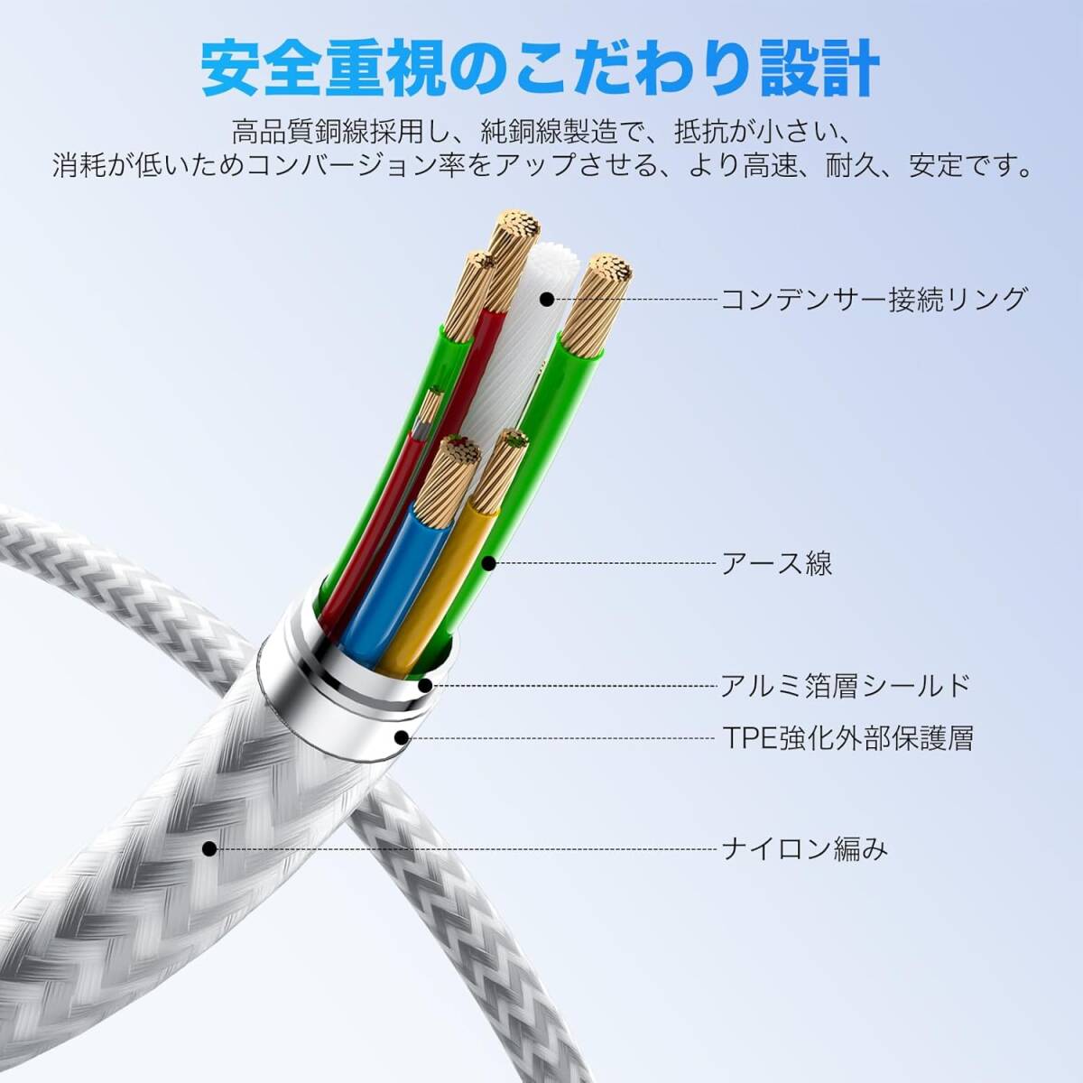 • 【優れた耐久性】高品質ナイロン素材を使用し、柔軟性と耐久性を両立。20,000回以上の折り曲げテストをクリアし、内部の無酸素銅やアルミ箔は劣化しにくく、耐磨耗性にも優れています。