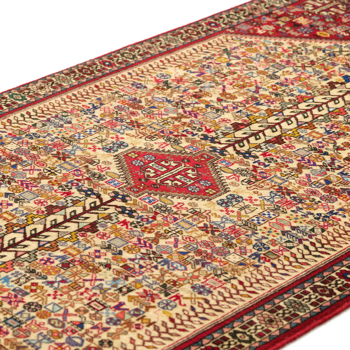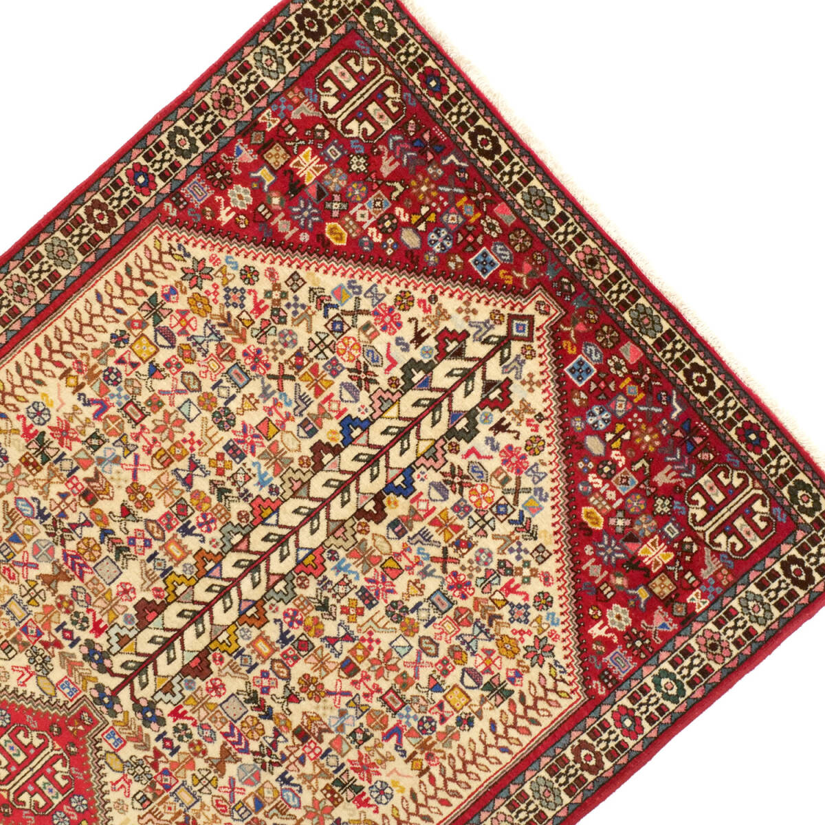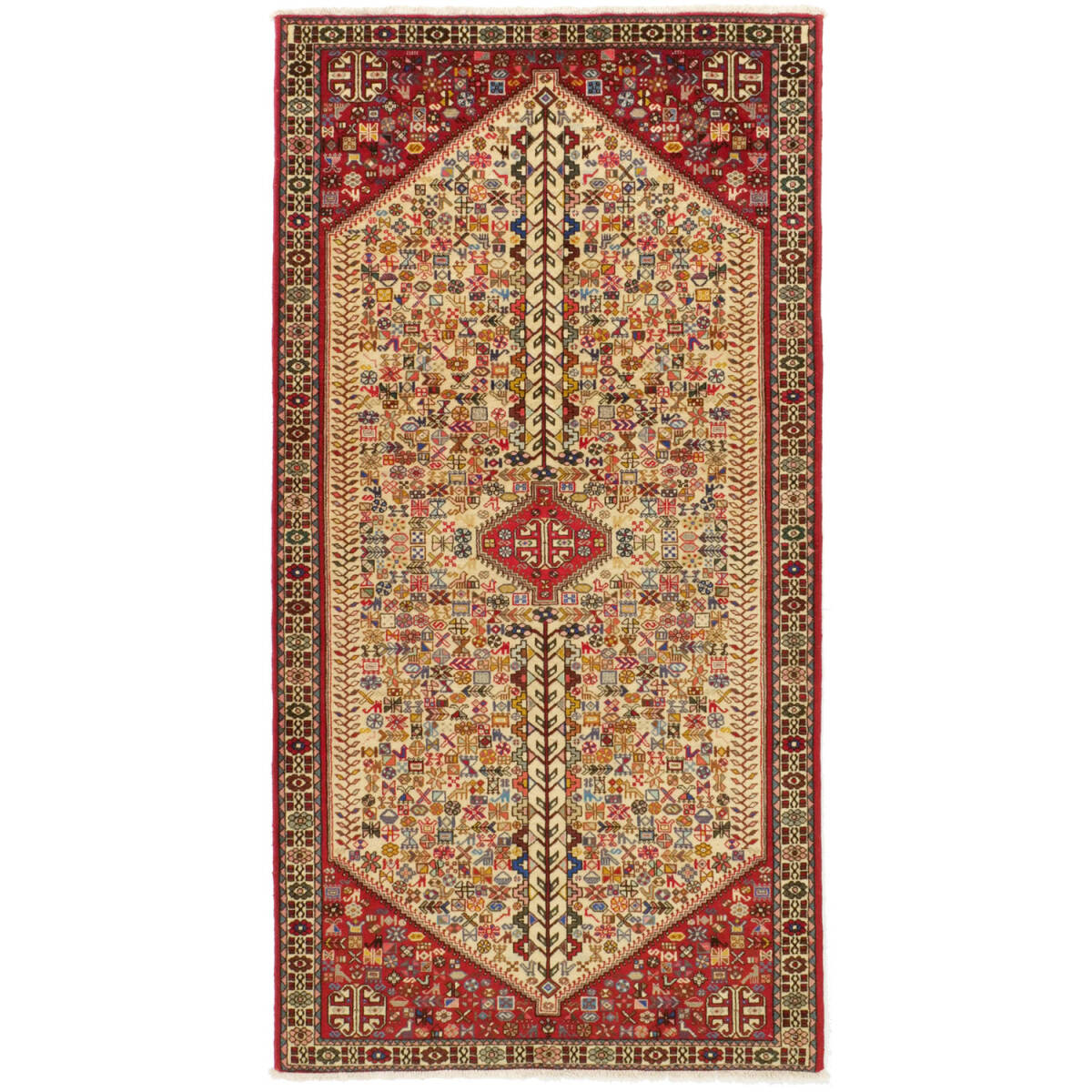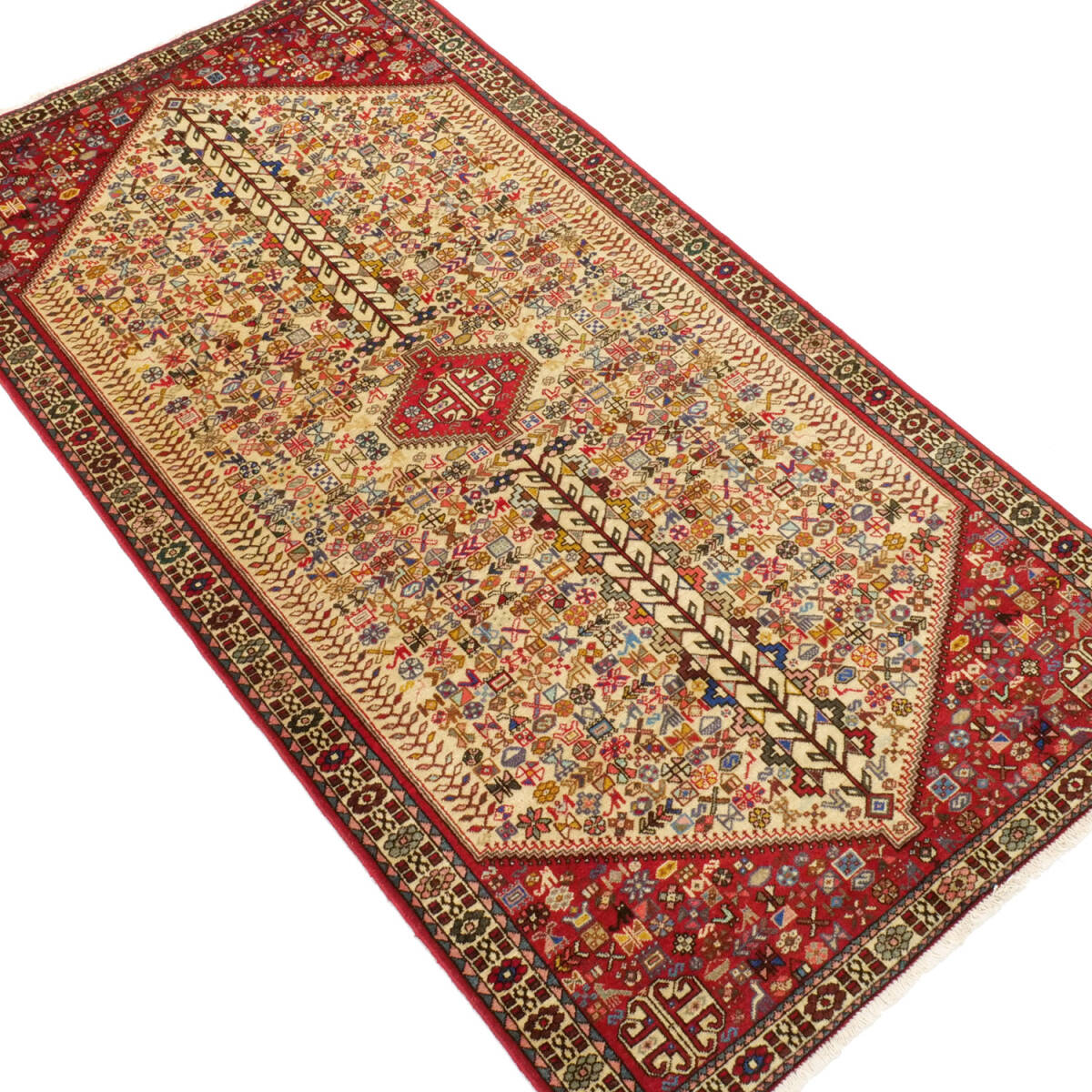 1950年代にアバデで制作されたセミアンティークのペルシャ絨毯です。中央に生命の樹を象徴するモチーフが堂々と配され、その周囲には色とりどりの部族的モチーフがびっしりと織り込まれた力強い構成が特徴です。