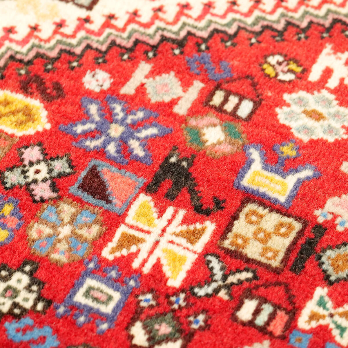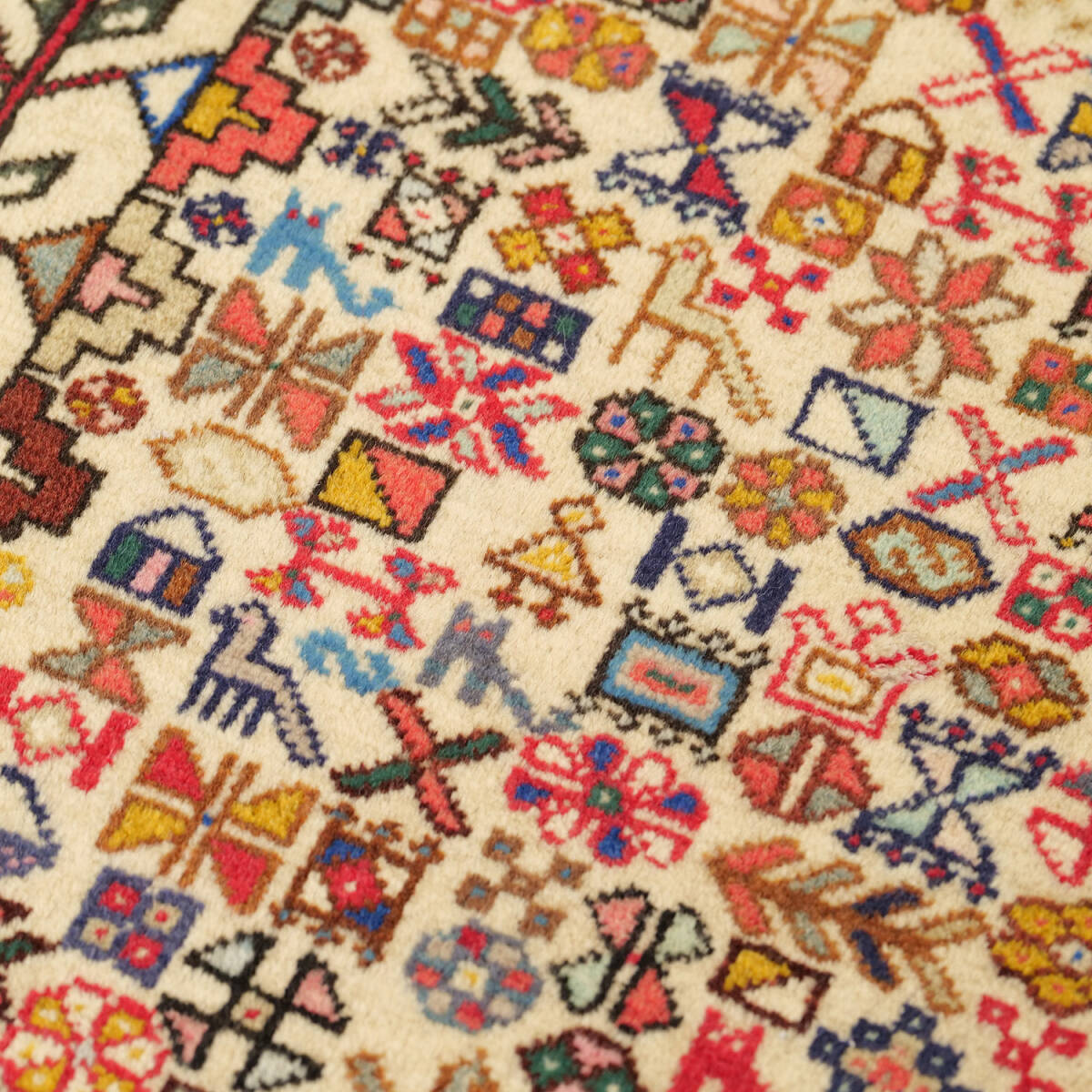 生成りを基調に、赤・黒・黄・青・緑などの多色使いが調和し、素朴さと華やかさが同居する印象です。