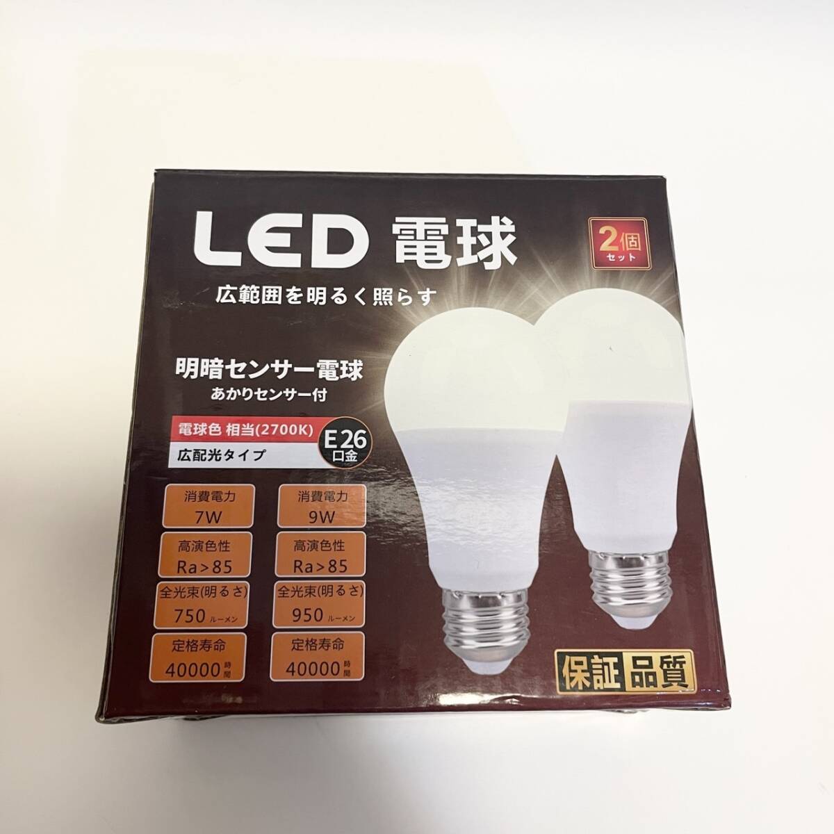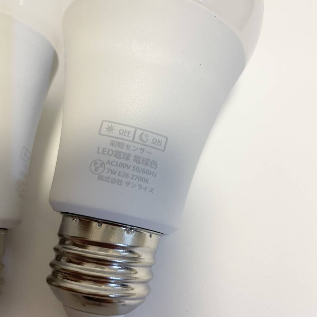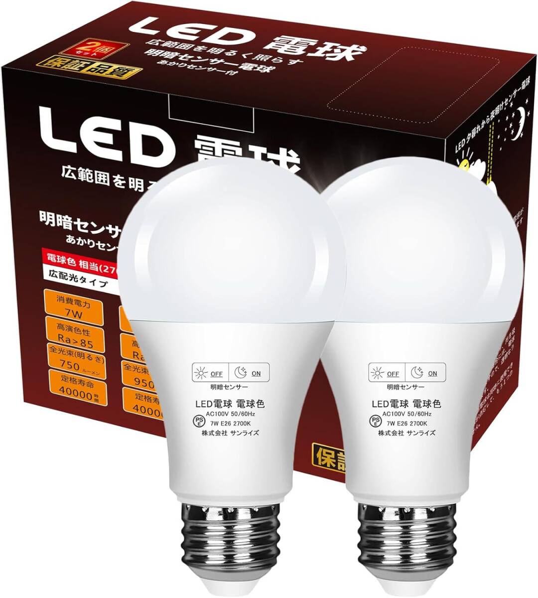【明暗センサーled電球仕様】口金:E26、定格電圧:AC100V 50/60Hz、消費電力:7W(60W相当)、全光束:750ルーメン、色温度:2700K 電球色、演色性:Ra85、調光器非対応