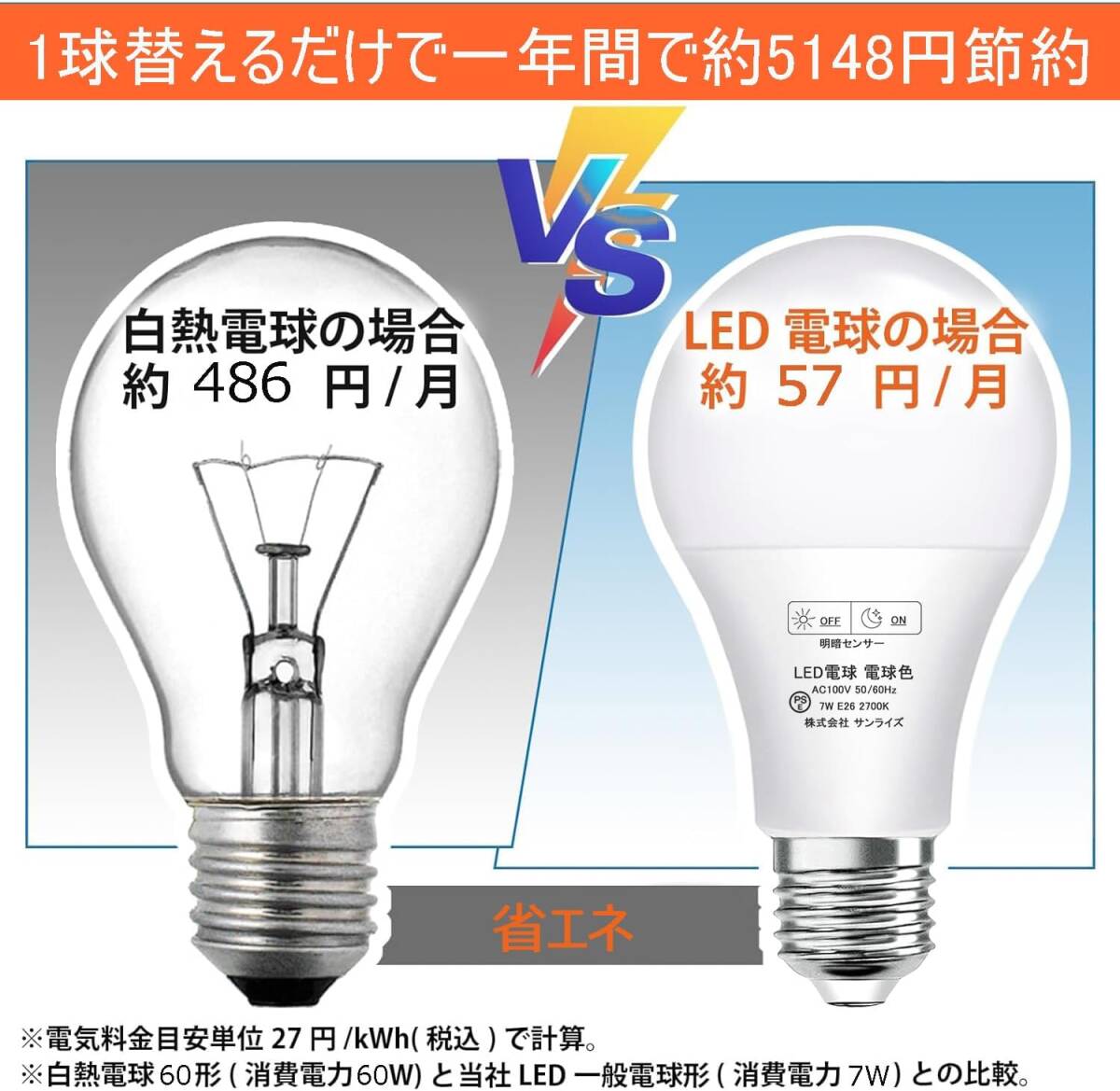 【高輝度&省エネ&長寿命の電球 明暗センサー】高品質なLEDチップを採用して、7Wの消費電力で、750 lmの明るさがあり、従来の60W白熱電球と比べ、約90%の電気代を節約できます。しかも、40000時間の設計寿命なので、長持ちで頻繁に交換する手間とコストを削減できて、家計に優しいLED電球です