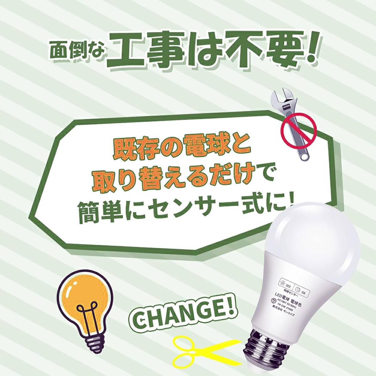 【取り付け簡単&応用性が広い自動点灯 電球】E26口金で、様々な照明器具に使用し、他のE26電球と交換性が高いです。また、電源をつけたまま、自動で点灯/消灯しますので、スイッチをON/OFF手間と無駄な電力を使用しません。明暗センサーライトは、玄関灯や廊下の常夜灯や防犯ライトとして使用可能、暗くなったら自動で点灯したい場所には最適です