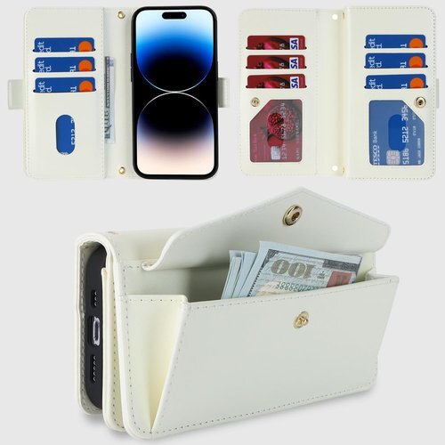 Eastwave for iPhone 14 Pro ケース ショルダー クロスボディアイフォン 14pro 留め具 肩がけ 首掛け 斜め掛け カードケース for iPhone14 Pro 手帳型 携帯 ケース case 財布型 カード収納 小銭入れ PUレザー 6色 ホワイト 1090