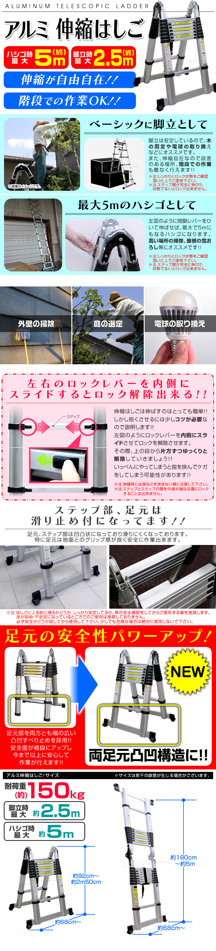 伸縮自在で使用時には1段ずつの引き伸ばし可能! 必要な高さでロックできます。 車のトランクに収納可能。どこにでも運べるコンパクトサイズ! 折りたたんでもたったの17cm!収納スペースにも困らない! さらにアルミ製のパイプとダブルロックの設計で頑丈、安全! 足元の安全性パワーアップし、今まで以上に安心して作業できます! 私生活に不可欠なはしごです! 電球交換やエアコン掃除、2階~3階の外壁、洗車など様々な場面にて活躍! 【商品仕様】 最長:500cm(脚立時:250cm) 収納時:92×68cm 質量:18kg 最大耐荷重:150kg 素材:アルミ(連結部分:スチール) 【注意事項】 ・商品の重量が重く、ケガを防止するためにも、2人以上での作業をされますようお願い致します。 ・ロック状態を確認した上でのご使用をお願い致します。 ・天板部分に乗ってのご使用は危険な為、お止め下さい。 ・足元が不安定な場所などでのご使用はお止め下さい。 ・海外からの輸入製品となりますので、製造、または配送の過程において生じた、細かなキズやへこみが見られる場合がございますが、機能性や品質上に問題はないため、返品や交換の対象とはなりません。予めご了承の上、ご購入をお願いいたします。 ・商品を使用して発生した事故・トラブル・破損等につきましては一切の責任を負いかねます。 ・商品は、モニターによって色合いが異なって見える場合があります。 ・仕様・デザインは改良のため予告なく変更することがあります。 |