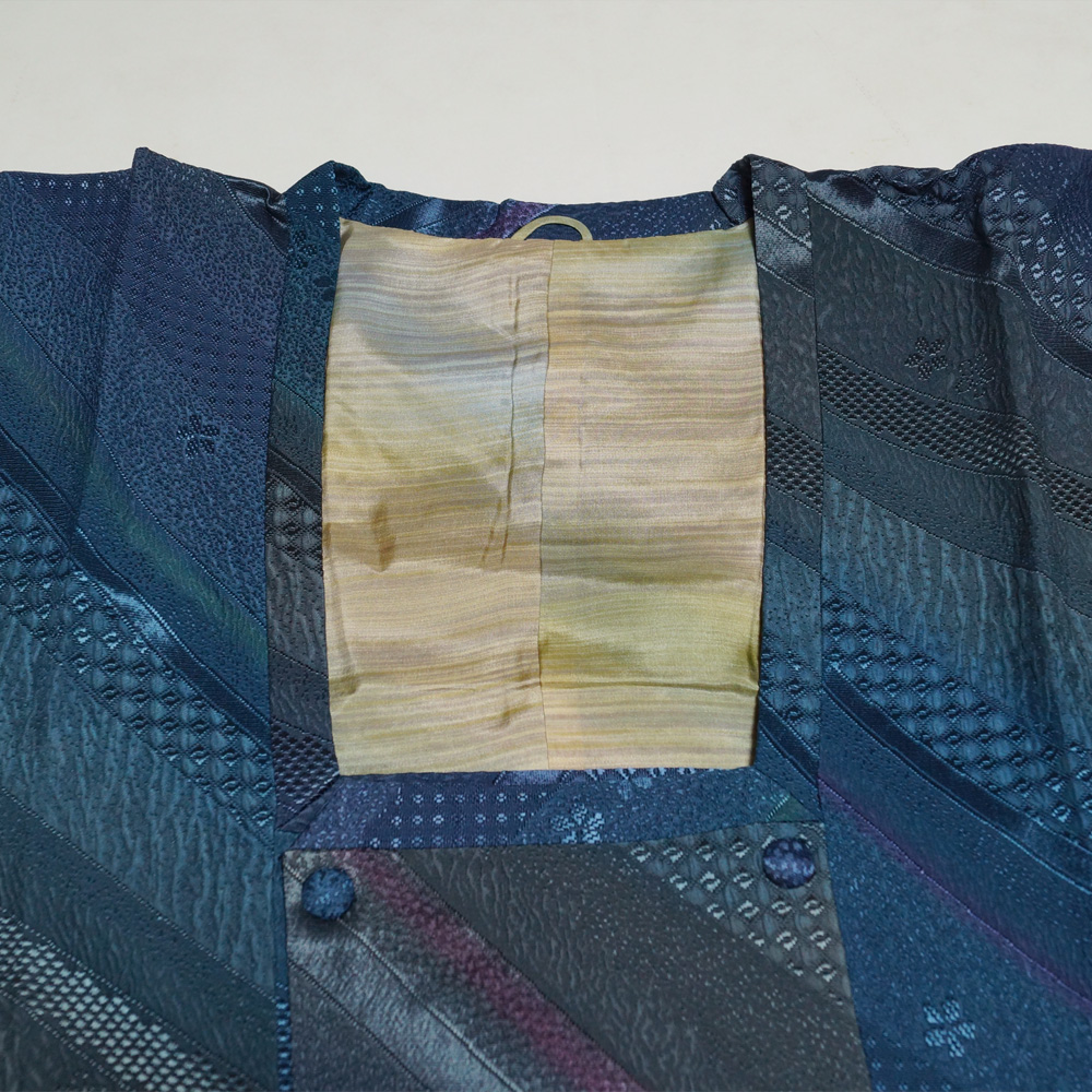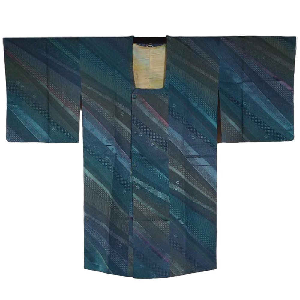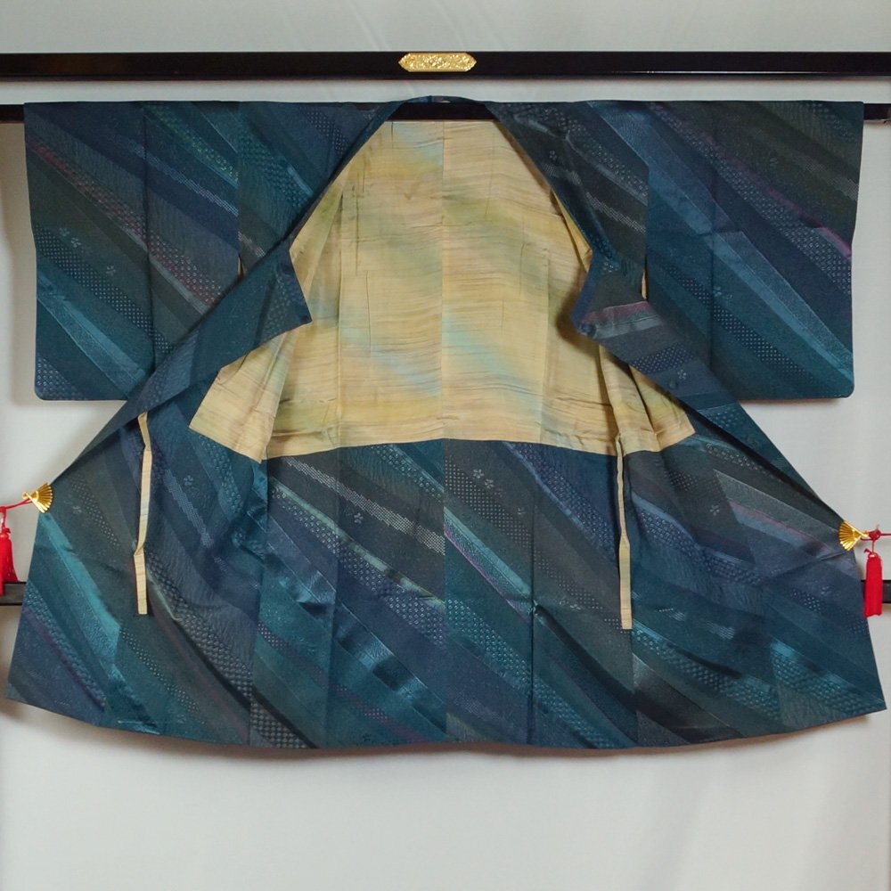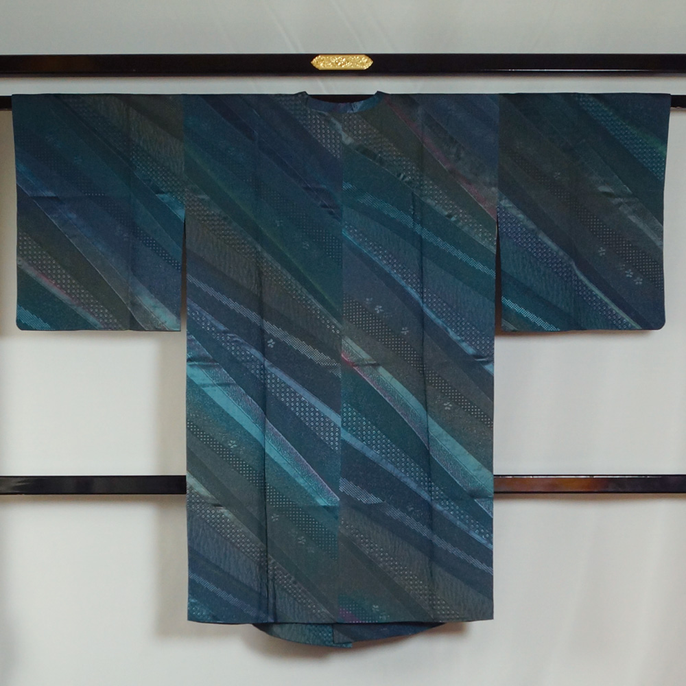 | 商品 説明 | 高麗納戸色系のぼかし地にラインに小花などの模様が地織された道行コートです。羽裏は横縞模様が染められております。 余り布があり、銘彩染 村田彩次郎氏とあります。 |