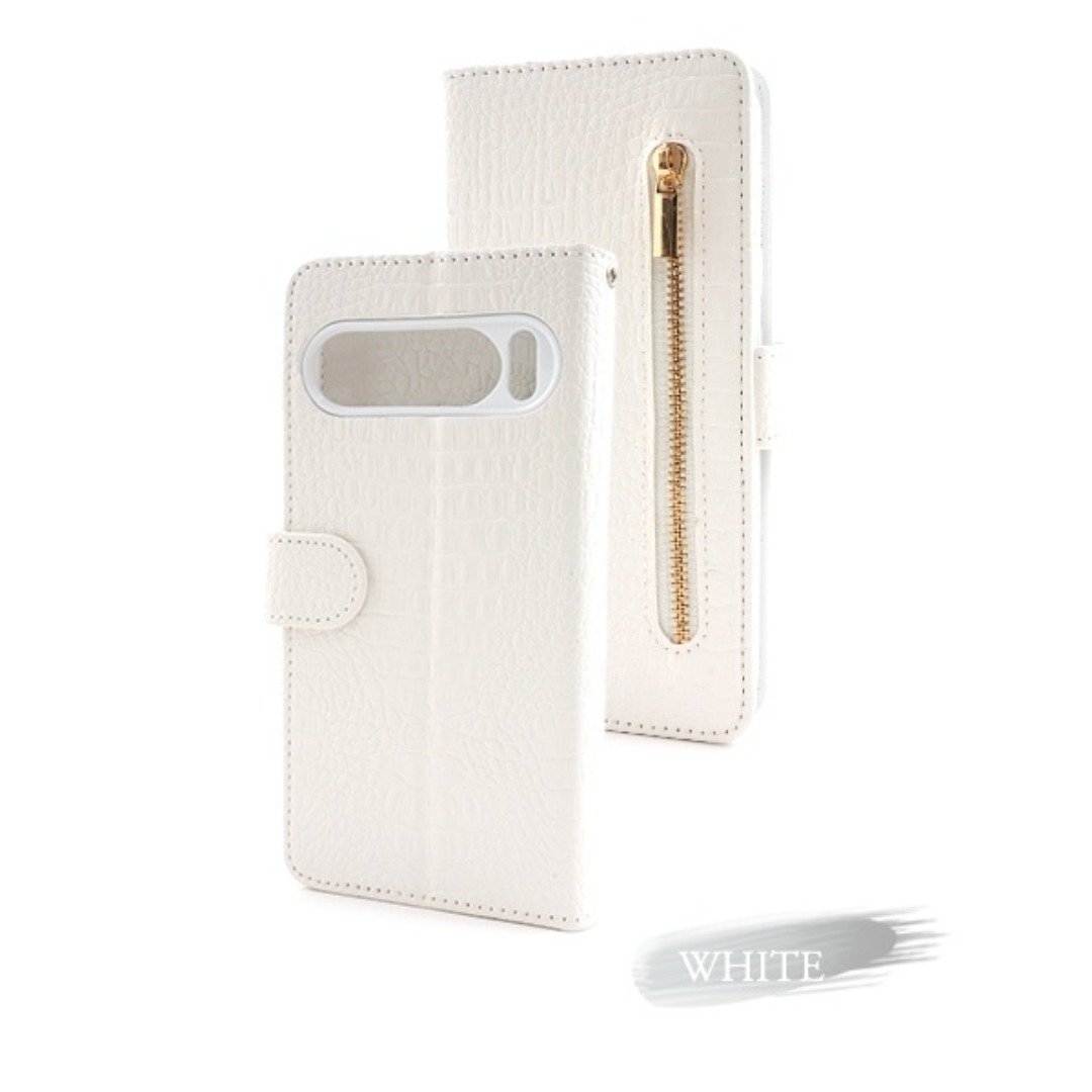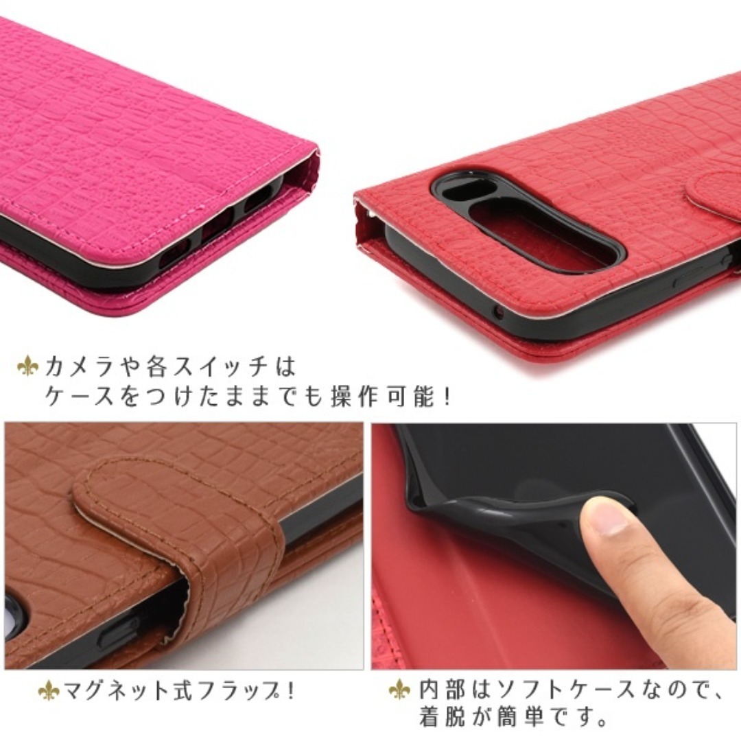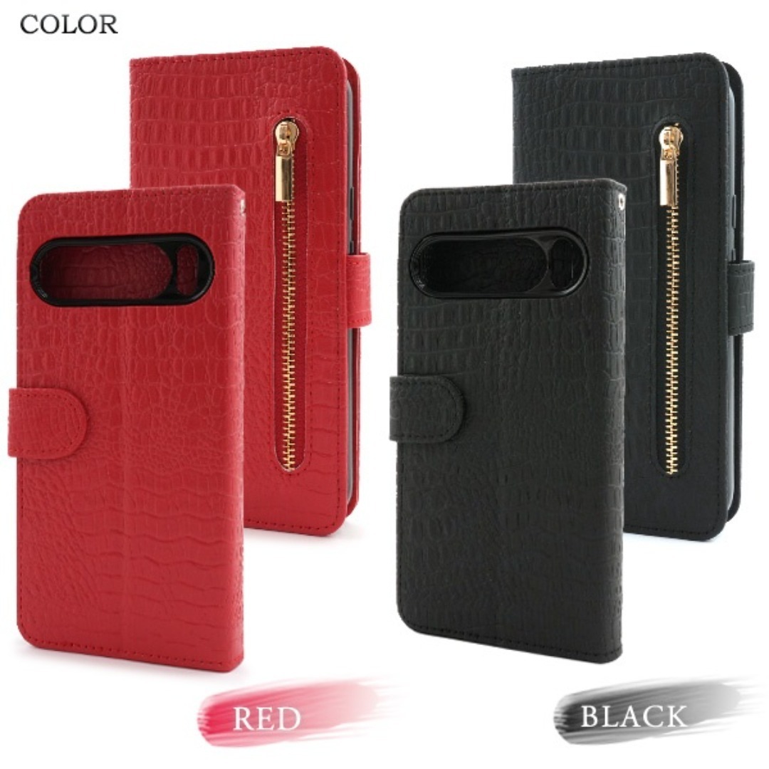 クロコダイルレザーデザインの手帳型ケース。
